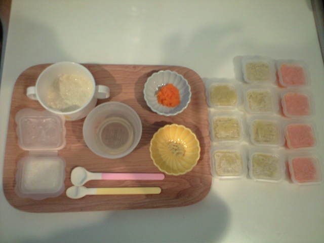 7日の離乳食。赤がにんじん、黄色がサツマイモ。豆腐とお粥とだしスープ。だしは昆布と少量のかつお節のだし。かつお節は赤みの魚なのではじめはなるべく使わない方がいいと言われて少量だけ加えました。右のパックはサツマイモとにんじんを小分けにパックした冷凍用!これで1週間はもちそう。最近はスプーンの歯ざわりがいいのかスプーンをパクっと噛み付いてくれるので口からあまり漏れずに食べさせることができるように。サツマイモは飲み込みにくいのかなかなか食が進まなかった・・・栄養士さんのお話だと一生の味覚は離乳食の時期にどれだけたくさんの食品に触れたかで決まるのだそう。大変だけれどできるだけたくさんの食べ物に挑戦したいと思います!
