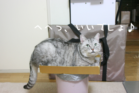 しまが、箱のふたの上に座っていたのでそのままゴミ箱の上に・・・移動。どうやら、気に入ってしまったらしい。テンションあがったしまさんはあちこち走り回る。そんなしまさんを抱っこしたら「パシッ」と顔にしまのパンチが・・。ツメがグサッと鼻のてっぺんにつきささって・・・流血(涙)顔はやめてください・・しまさん。「ごみ箱の上のしまさん。」に一日一回投票クリックお願いします。 ↓ ↓ (クリックすると次のページに飛びます。それでしまさんに1票入ります。)