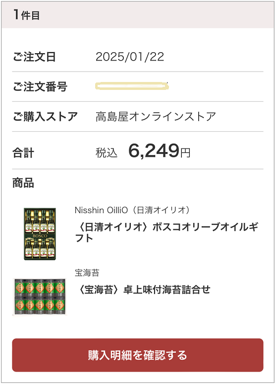 こんにちは。楽外ですが高島屋オンラインさんの食料品ギフト処分セールで欲しいものがあったのでポチしてきましたアクセス集中しすぎてサイトが激重・・・午前中1時間くらい奮闘してましたお歳暮ギフトがだいたい50%OFF~30%OFFくらいかな。最近スーパーでオリーブオイルがめちゃ高くなってて百貨店のギフト解体セールを狙ってました^^ペペロンチーノやアヒージョ作るのに欠かせないオリーブオイル、ボスコ エキストラバージンオリーブオイル(456g)【BOSCO(ボスコ)】[オ...価格:1,661円(税込、送料別) (2025/1/22時点)値上がり過ぎでしょーホント困ってたので助かります寒中御見舞 油 送料無料 ギフト 日清 ボスコ オリーブオイルギフト BG‐50送料がかかるのでついでに海苔の詰め合わせも一緒にコレで美味しいおにぎり作ります^^宝海苔 卓上味付海苔詰合せ H-50 内祝い ギフト 出産祝い お返し 結婚祝い...百貨店の催事場でも解体セールやってますが混雑してるし持って帰るの重いし^^;送料払ってでもネットで買えるのは有難いです高島屋オンラインは、楽天リーベイツ経由で3.5%ポイントバックです。お買い物マラソンの告知出ましたね~↓