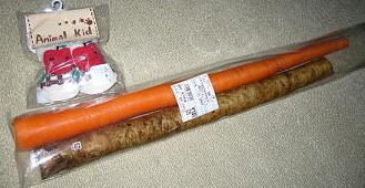 午後 はに丸ちゃんから携帯に電話があり「今 道の駅にいるんですけど 野菜いりませんか?」と…しかもなぜか「すっごいニンジン見つけたんです♪」という…す…す…すっごいにんじん?なんだか ものすっごく惹かれたのではに丸ちゃんに買ってきてコ--ル♪夕方 お出掛けから帰ってきたはに丸ちゃんが持ってきたのは…大きさ比較のため美桜の靴下を置いてみました確かにすっごいニンジンです♪