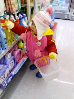 美桜の最近のお気に入りそれはコンビニのカゴ子供用の小さい買い物かごが大好きでコンビニに行くと即効でそれめがけて行きますで…なぜか毎回行く洗剤コ-ナ-買わないって言うのに絶対ここ行きます普通こどもは菓子コ-ナ-だろ!