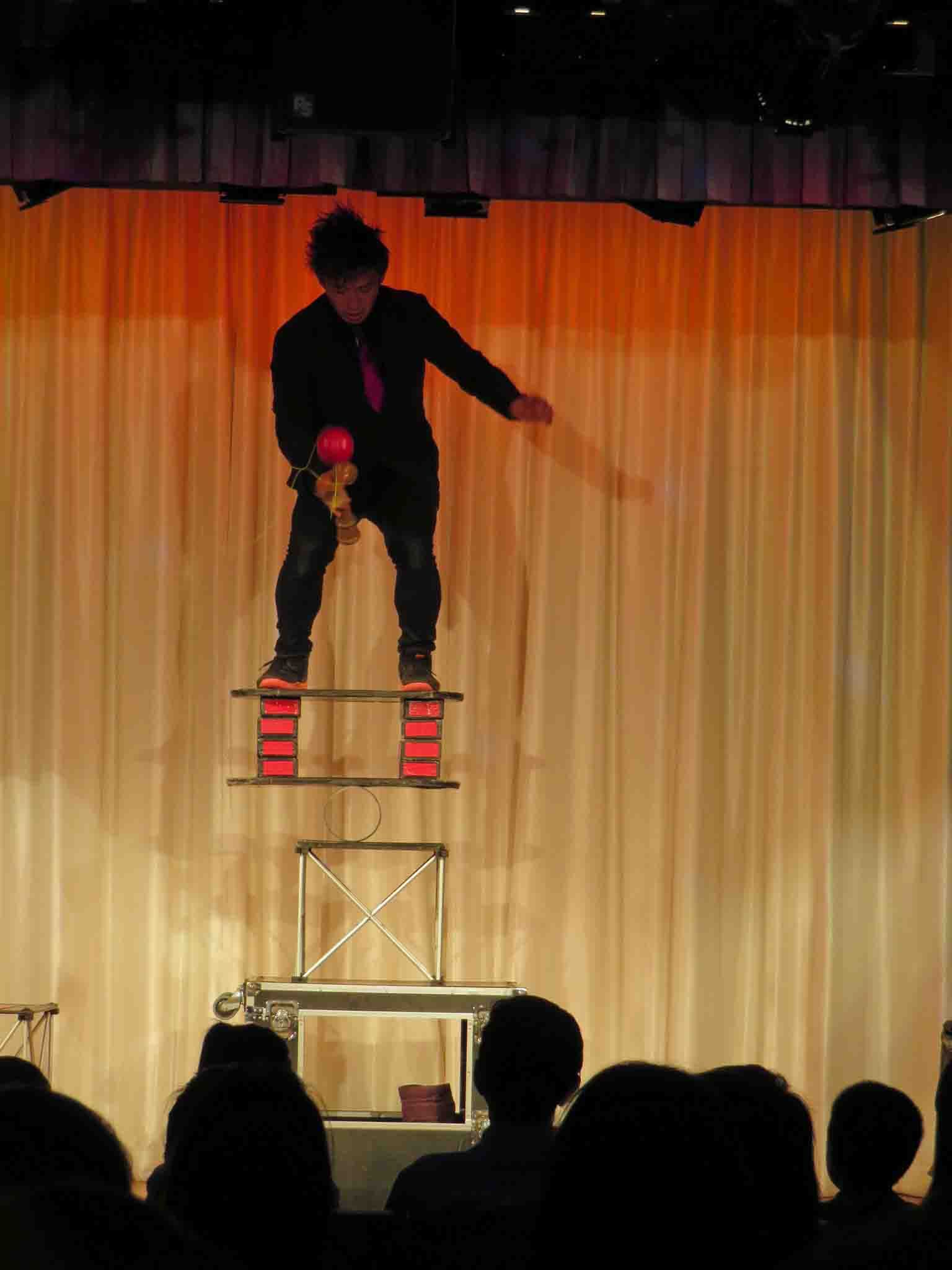 丸い筒の上に板を乗せその上に箱と板を乗せて乗ってけん玉