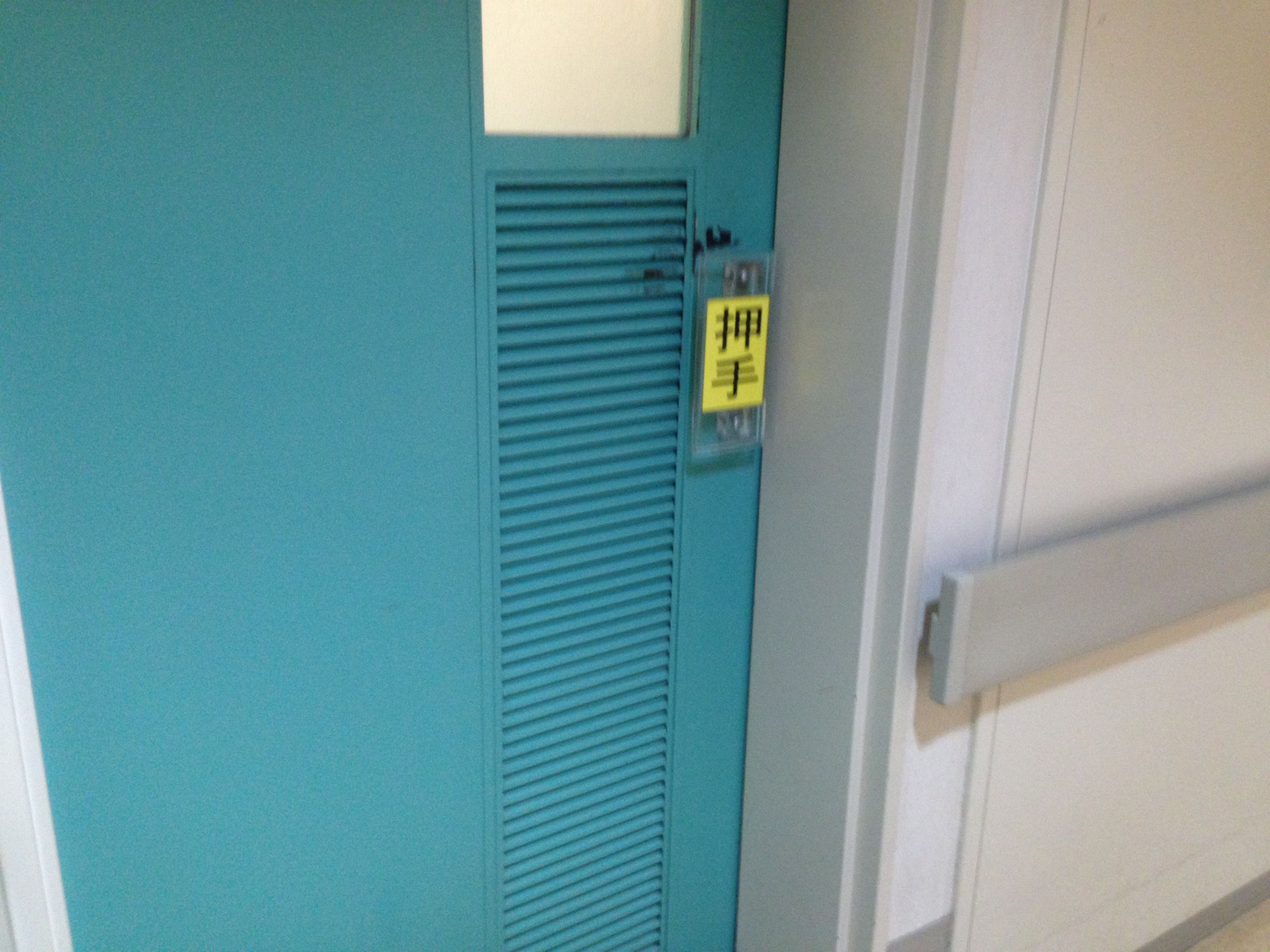 とある病院のトイレの入り口である。取っ手とか引き手というのは聞いたことがあるけれど、「押し手」と言うのはどうも力士の手形とか言うようなものらしい。こんなものは「押」の一字ですみそうなものだが、ひょっとしたら「手で押せ」と言う意味だろうか。「足で蹴っちゃいけないよ」と言うニュアンスの新造語か?この頃はとんでもないことをする人がいるらしいから。ちなみに裏側(内側)の表示はなかった。