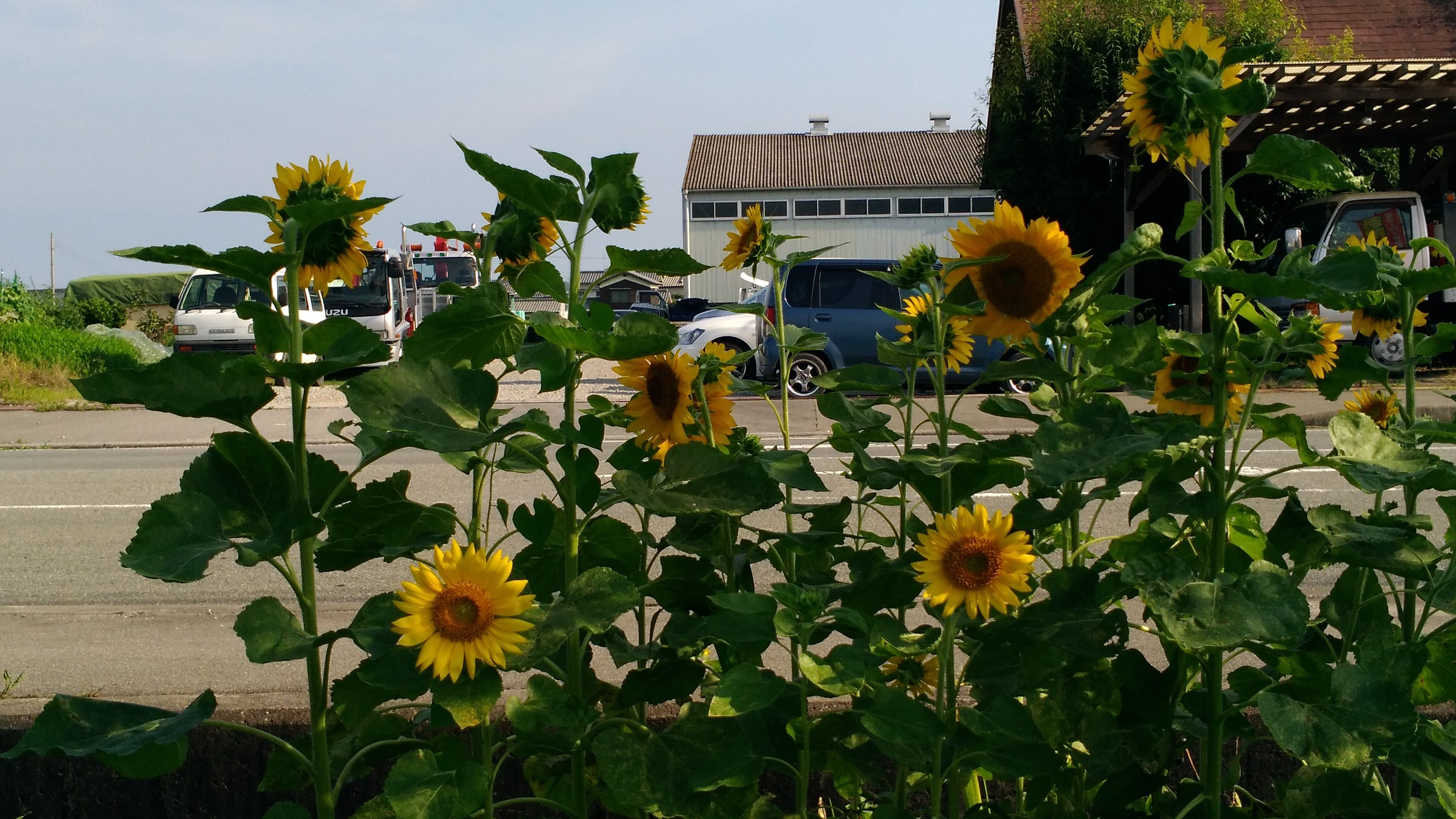 梅雨も終わったようで、暑い日が続く。夏のシンボルは花であればヒマワリだろう。向日葵と書くくらいだから子供の時には「ヒマワリは太陽の方向を向いている」とまことしやかに語られたものである。もしもそれが本当ならば軸がねじれてしまう筈だ、だからたぶん嘘だよ、と言ったのは小学校2年の時だった。昨年、佐用町でヒマワリの種を自閉君が貰ってきたので種を蒔いたら、最近花がつきはじめたが、これは北側から撮った写真。半分は北側を向いている。もう少し一方的になるかと思っていたが、東を向いているのもあり、西を向いているのもある。太陽に追随して動くなんて言うのは嘘っぱちだ。この時期、キウリが絶好調。30cmを超えるようなのが5本ぶら下がっている。連休にやってくる孫にとらせてやろうと更に一日大きくする。自分の背丈よりも高いところにあるのを見たら驚くだろう。