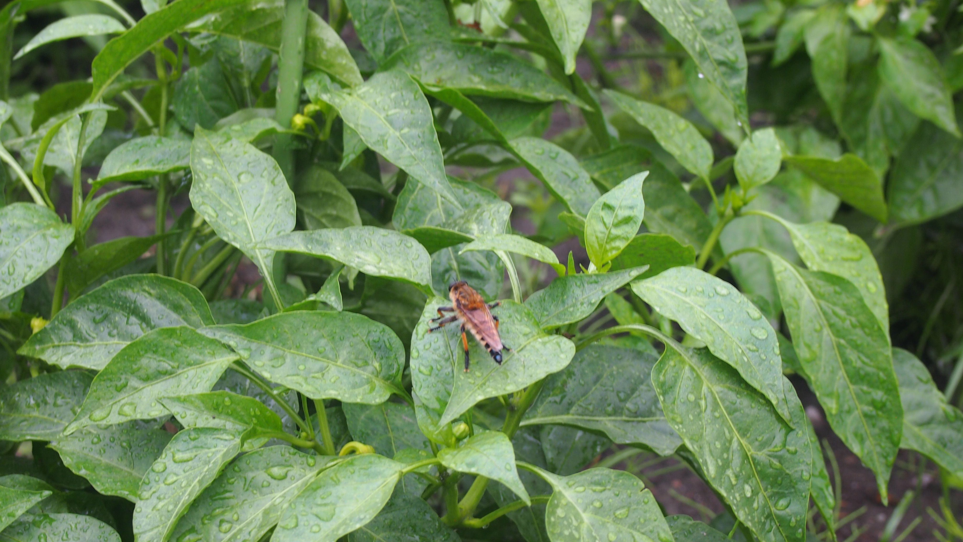 九州北部の雨は甚大な被害をもたらしている。友人の出身地である日田とか嘉穂とかが出てくると実家のほうは大丈夫だったのかなと気を巡らす。今日は私の住むところも瞬間的に豪雨に見舞われた。視界は100m以下だと思った。視野は真っ白、ワイパーは間に合わない。こんな状態が続いたのだろうなと思った。野菜をとりに行ったら、唐辛子のまわりで珍しく蜂の羽音がするのでカメラをとりに戻ったが、帰ってきた時にはもういなくなり、別の客が。大きなアブがとまっていた。あまり近寄りたくないものだ。蜂はこの小さな白い花から花粉を集めていたようだ。植物が花をつけ、虫が受粉し、結実を待って人間がいただく。雨の合間に出てきたのだろう。無事に巣に帰ったのかな。こちらはキウリ。言うまでもないが、早くに結実したものは地面でとぐろを巻いていた。やっと一人前にぶら下がる実がついた。