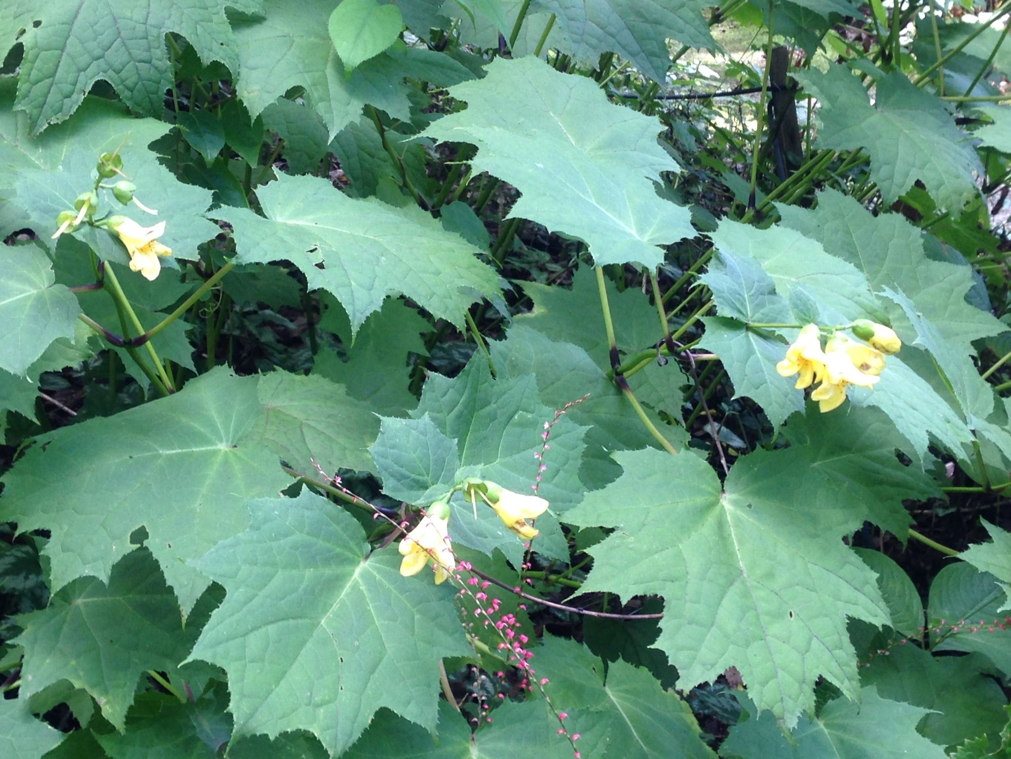 茄子の木にカツを入れるとこんなに元気になるんだ、と少し驚いている。普通の茄子はアスペクト比4位の電球のような形をしているが、今好調なのは長茄子の方だ。アスペクト比は10以上にも及ぶ物がある。あまり太くはならないので、焼き茄子にすると食べるところが無くなりかねない。漬け物かサラダにする方が向いていると思う。こんな具合にぶらぶらと太い紐のようにぶら下がっている。東日本ではあまり食べられないようだが、皮が薄く、柔らかいので輪切りにして煮付けにも出来る。いつごろまで収穫できるのか、楽しみだ。