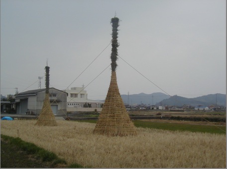 火をつける1週間前に立てて、2日ばかり前から近所の人が正月の飾り物やら縁起物を持ち寄ってくる。当日6時に小学生が火をつけ、竹のはぜる音を聞きながら餅を持参して、焼いて食べる。この時期、ともかく強風が吹かないことを祈るのみだ。
