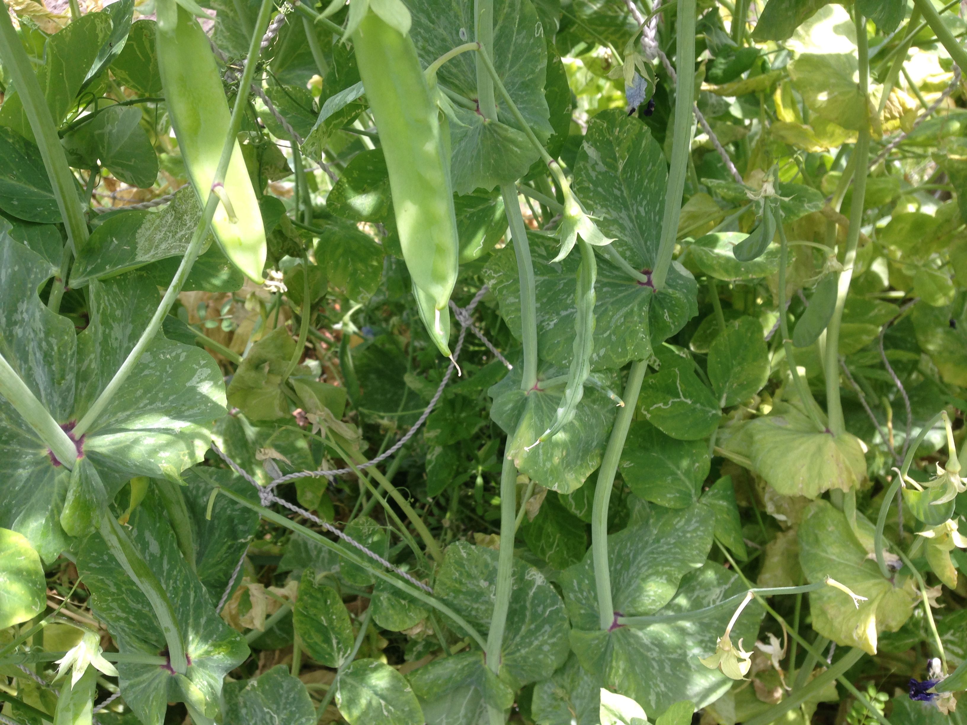 次はサヤエンドウ。よく見ると、どうも一番に結実したものよりもその下の方が太り具合がいいように思う。