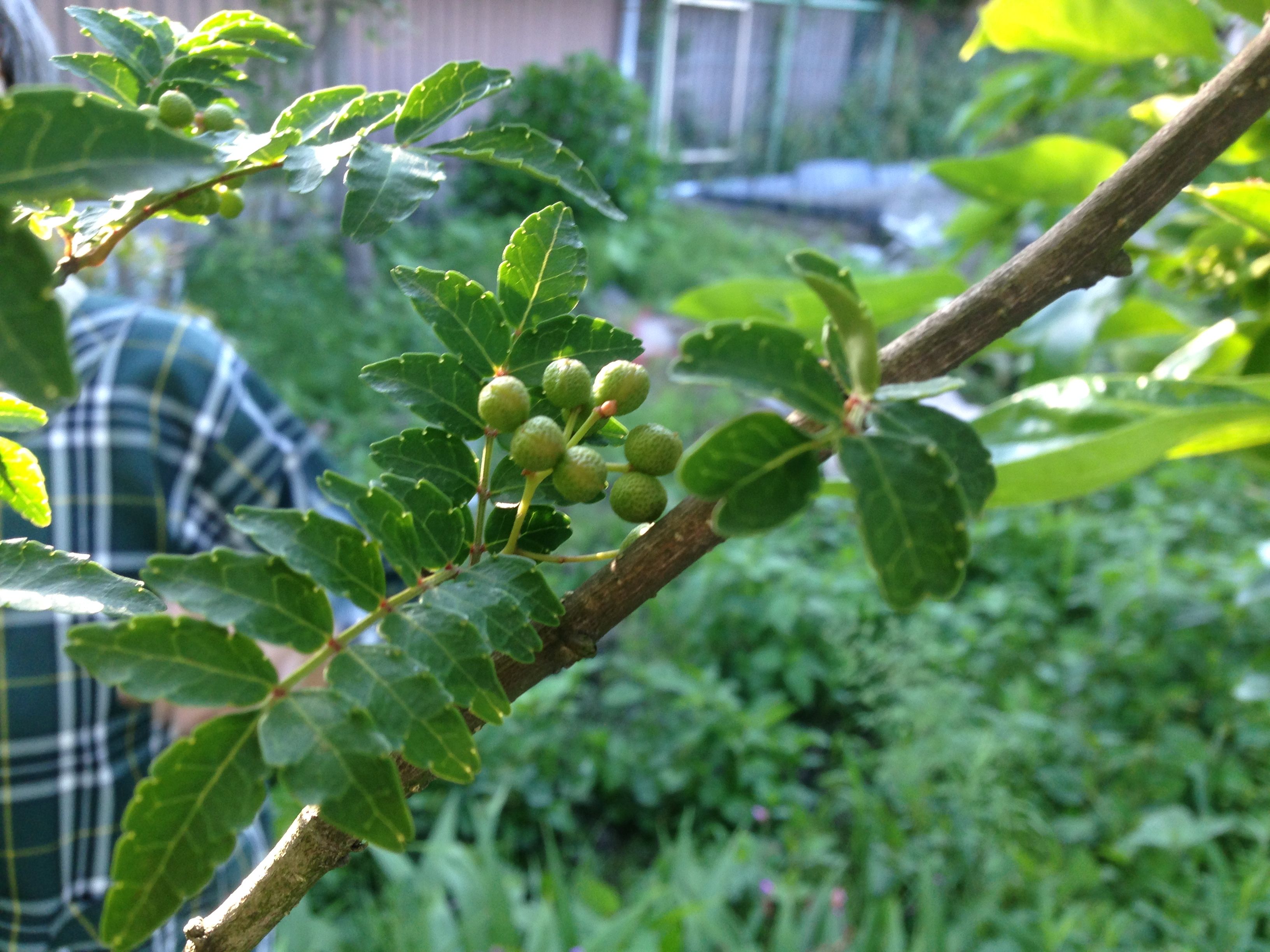 次は自宅。サンショウが実を付けていたのでこれを収穫。お汁のダシに使った昆布を切って醤油と炊き合わせて佃煮を作る。