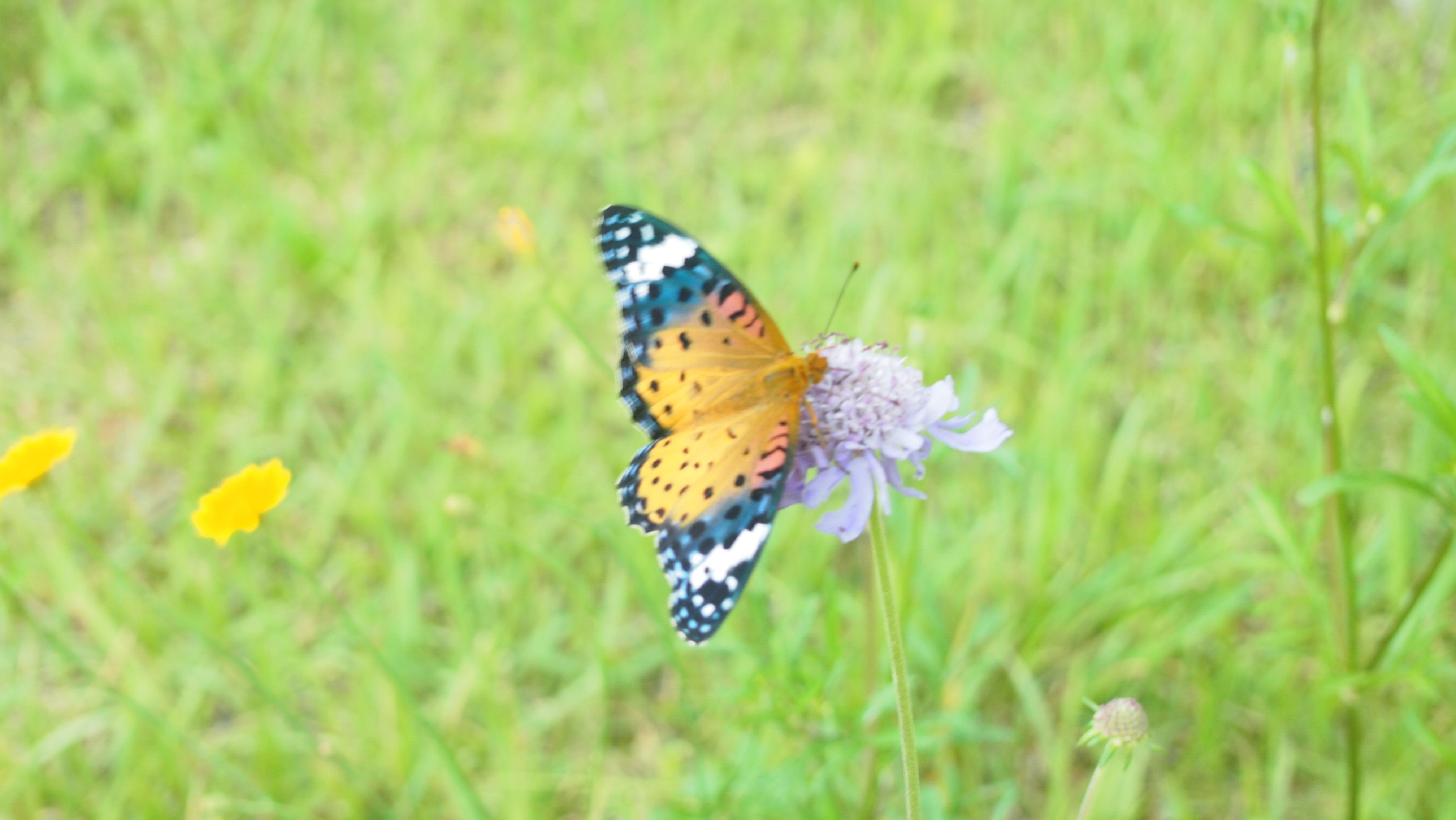蝶の名前は不明。花のほうはマツムシソウということです。