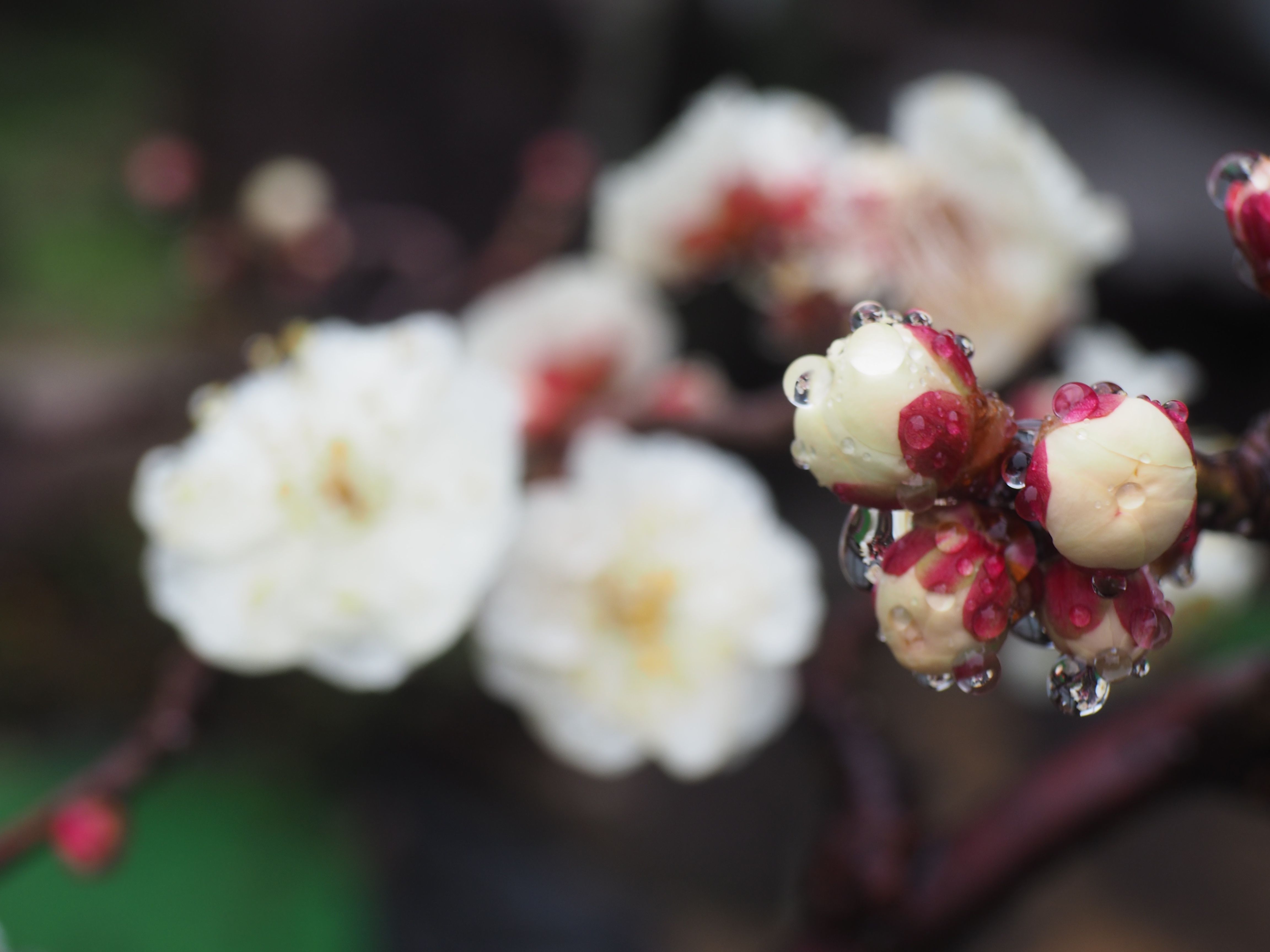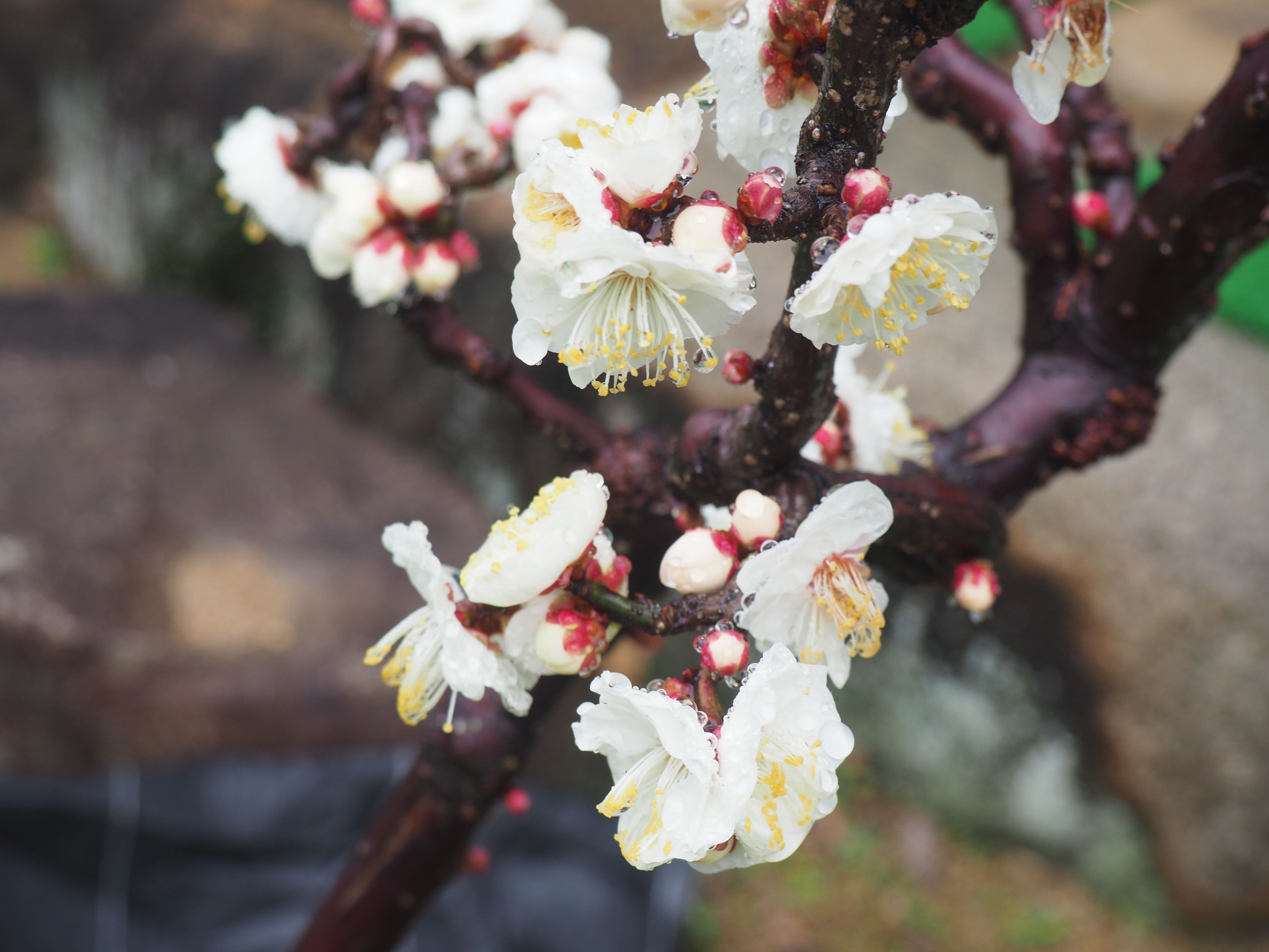 こちらは白梅。これから盛りを迎えるが、蕾がたくさんあって非常に楽しみ。カイガラムシの防除でマシン油を散布したので、てかてかになっている。雨の直後で水滴があちこちに。