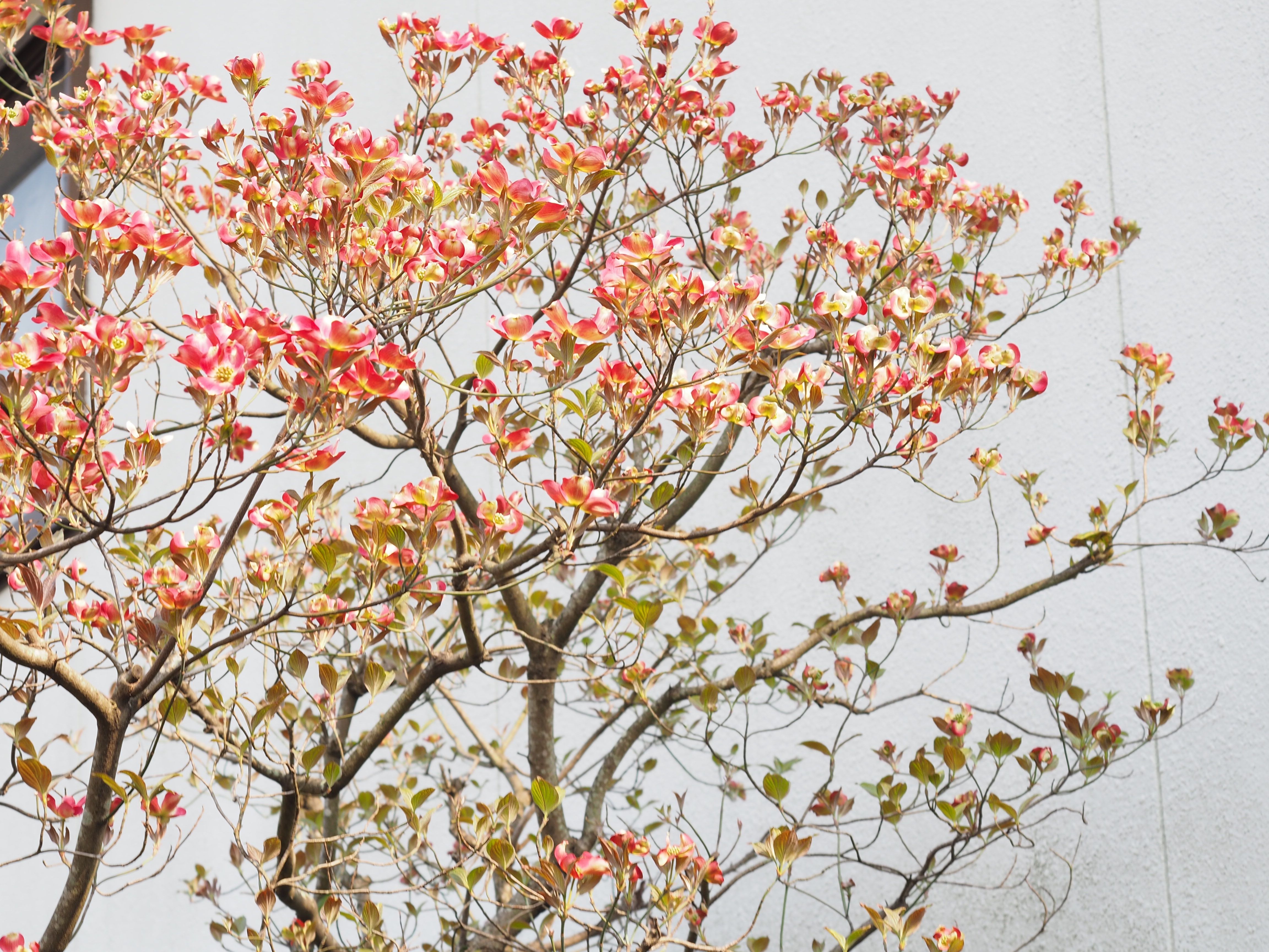少し小さめだがハナミズキも咲き始めた。秋に剪定しなかったので花芽が多すぎるのかも知れない。