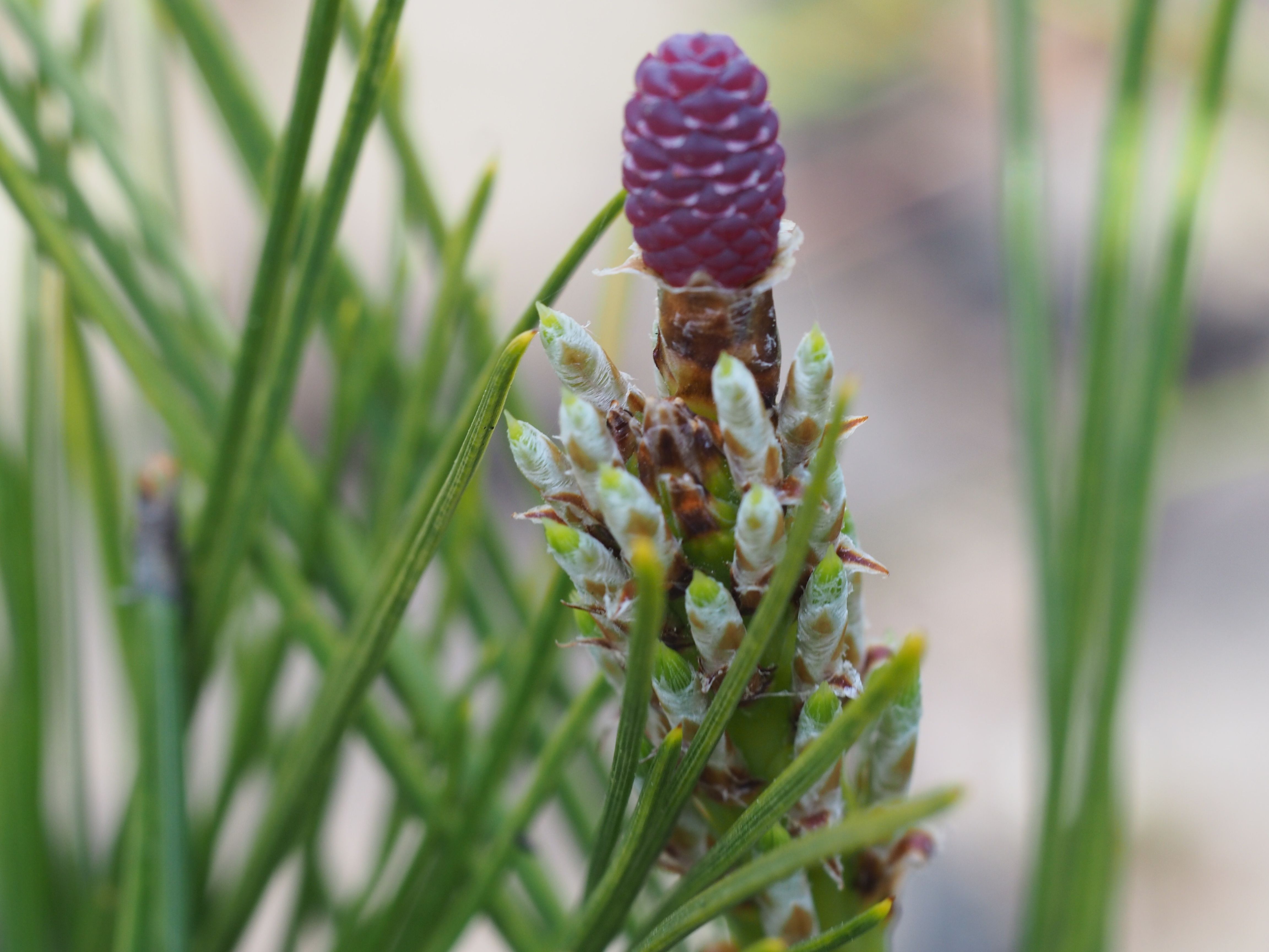 この時期、クロマツにはいわゆる「ローソク」ができる。冬芽がどんどん伸びて、20cmくらいになる。放っておくと秋には木質化し、葉も伸びて試験管ブラシのようになってしまうのでこの時期に摘んでしまう。ちょっと珍しいものを見つけたのでマイクロニッコールの出番になる。(当然仕事ははかどらない)