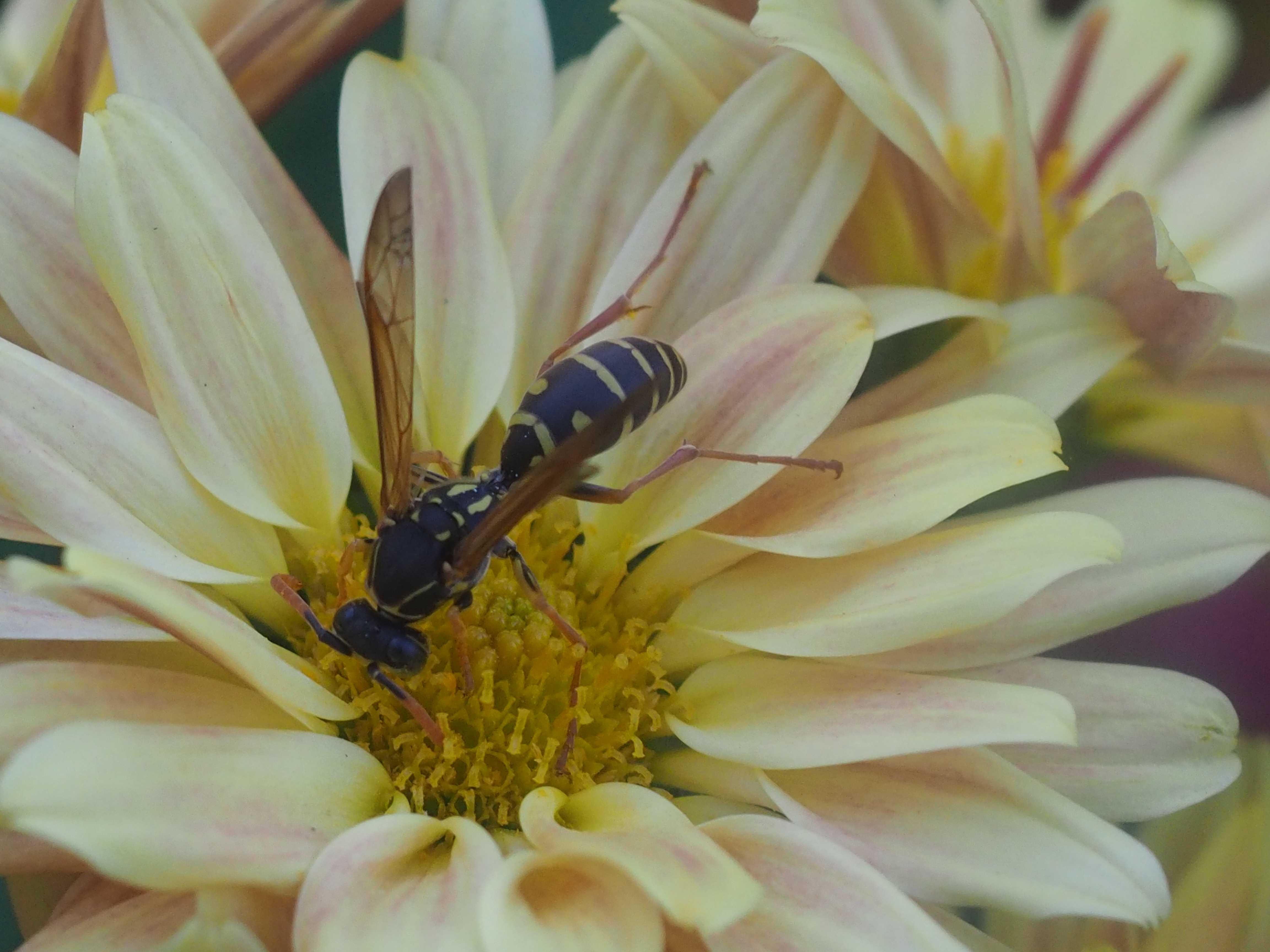 アシナガバチの方が動きが遅く、写真は撮りやすいですが、なんで花に?と思って調べたらアシナガバチはスズメバチの仲間なんですね。普段は青虫とかの肉を食べるらしいのですが、蜜も吸うそうで。寒くなって餌が少なくなったのかも知れません。