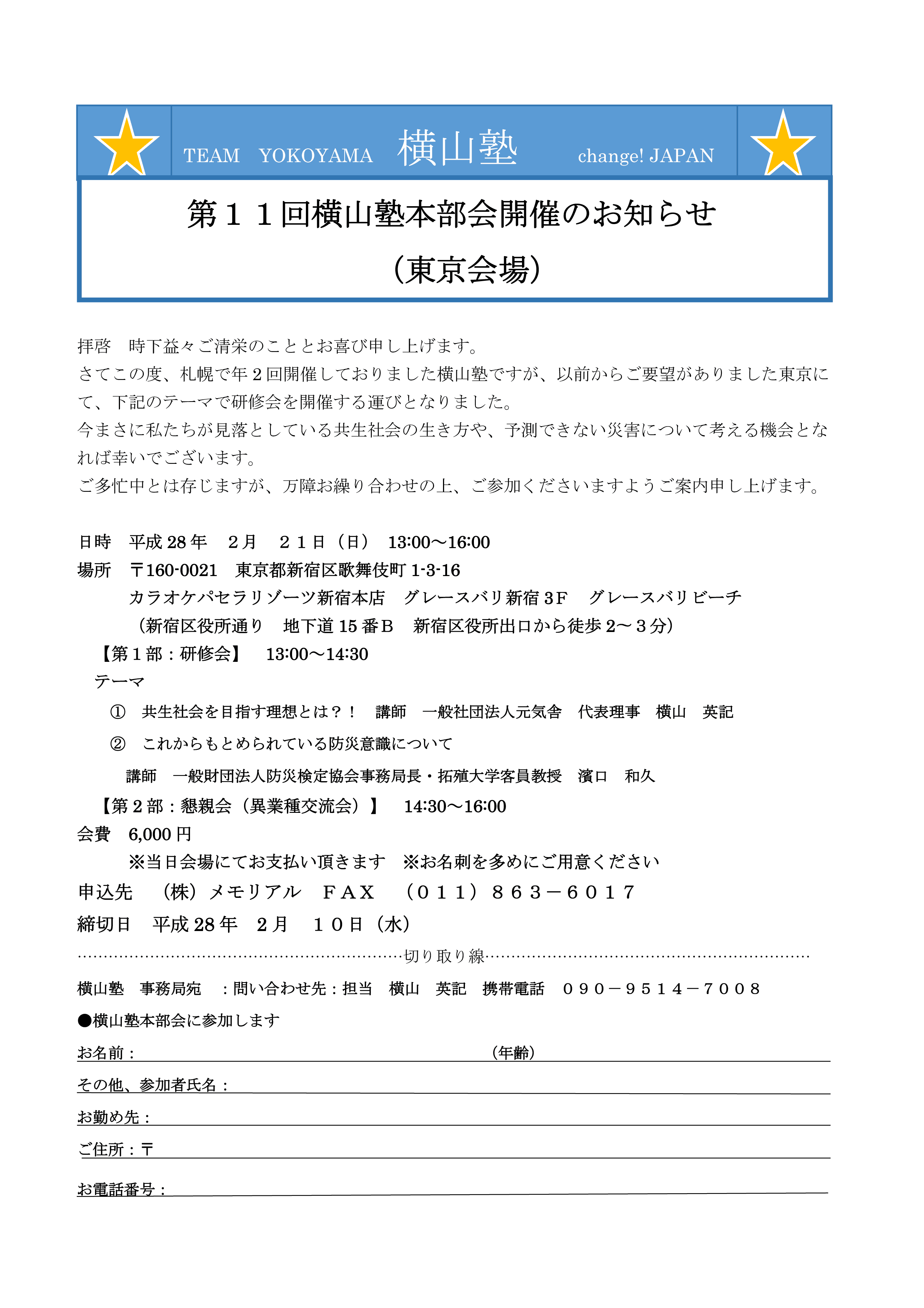 拝啓 時下益々ご清栄のこととお喜び申し上げます。さてこの度、札幌で年 2 回開催しておりました横山塾ですが、以前からご要望がありました東京にて、下記のテーマで研修会を開催する運びとなりました。今まさに私たちが見落としている共生社会の生き方や、予測できない災害について考える機会となれば幸いでございます。ご多忙中とは存じますが、万障お繰り合わせの上、ご参加くださいますようご案内申し上げます。日時 平成 28 年 2月 21日(日) 13:00~16:00場所 〒160-0021 東京都新宿区歌舞伎町 1-3-16 カラオケパセラリゾーツ新宿本店 グレースバリ新宿 3F グレースバリビーチ (新宿区役所通り 地下道 15 番B 新宿区役所出口から徒歩 2 3分) 【第1部:研修会】 13:00~14:30 テーマ1 共生社会を目指す理想とは?! 講師 一般社団法人元気舎 代表理事 横山 英記1 これからもとめられている防災意識について講師 一般財団法人防災検定協会事務局長・拓殖大学客員教授 濱口 和久 【第 2 部:懇親会(異業種交流会)】 14:30~16:00会費 6,000 円※当日会場にてお支払い頂きます ※お名刺を多めにご用意ください申込先 (株)メモリアル FAX (011)863-6017締切日 平成 28 年 2 月 10日(水)