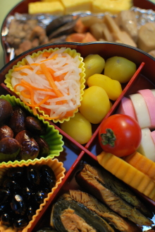 お重に並べるときだけ、素材別にしてみたら、煮しめらしく見えるではないか!