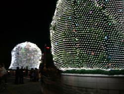 もうすぐクリスマスじゃないのさーなのに冬のイベントを何一つやってないーーーバタo((><o))((o><))oバタ京都・花灯路、夜間特別拝観行けず、神戸ルミナリエもちろん行けず年末ジャンボ買い損ねる・・・・ヽ(´Д`ヽ)(/´Д`)/イヤァ~ンこりゃぁ一つぐらい思い出作りしとかなきゃ、いい年越せないよ~と、あれこれ探していると、 ロームイルミネーション2008何ですか、それは?京都にもイルミネーションがあるの?京都暮らしも日の浅いまこは初めて知ったよ!ダンナに知ってる?と聞くと知ってるとのお答え・・・・・ はよ言わんかーーーーーーい! (ノ ̄皿 ̄)ノ~~~~~~┻━┻毎年かかさずわざわざPL花火大会を見に行くほどの夜の光り物大好きなまこに、なぜそれを早く言わない!さぁ行くよ、今日行くよ、今行くよ12月25日まで開催らしいが、クリスマスに近づくほど混みそうな気がするのでさっそく買ったばかりのスリング持参でお出かけ思ったより渋滞もなく、駐車場も難なく入れたけど、人が多いので踏み潰されないようにルミナをスリングに押し込むさぁ~見えてきたよ~おお~~!なんかすごいんじゃないの!まるで巨大肉まん!肉まんの間に入ると、メインストリートらしく、イルミネーションで飾られてた道写真ではわかりにくいが、もっと明るくてキレイだった(^^) 歩道は狭くて人がいっぱいなので、ルミナにはほとんどスリング中夜のお出かけが少ないのでガタガタ震えていたらしい最終目的地の公園に到着芝生の敷き詰められた公園で、ここでやっとルミナを解放(^^♪人が少なかったら、もう少し遊ばせてあげれるのに~~あれ~もう終わりなんだ~( ̄д ̄)と、ちょっとがっくりだがローム1社でここまでのイルミネーション拍手を送りたい ただ・・・無理ルミナの夜の写真は絶対無理