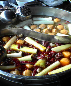 山のような唐辛子、にんにく、生姜、葱、チャイニーズスパイスで汁の見えないスープで肉、野菜、あやしげな団子、豆腐、ソバ…なんでも煮込んでしまう荒っぽい鍋だ。