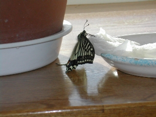 RUNAの実家でなんとアゲハ蝶が家の中を飛んでいるんです。はじめ見た時は目の錯覚かと思ったんですって。その後、「ああ、外にいるのね」って納得して・・・ってありえな~い!!(笑)どうやら秋口まで外に置いておいた鉢花に蛹がついていて羽化したんだと思います。RUNA実家ってセントラルヒーティングなので年中、暖かいんですよ。それで、もう春だと思ったのかな~これはキアゲハでしょうか・・・・しかし、困ったな~春だったら外に逃がしてあげれるけど今は極寒・・・今、外に出したらあっという間に命尽きてしまうでしょう。そんな鬼のようなこととても出来ません。ネットで飼い方調べてみました。エサ?というか蜜の代わりにポ○リやアク○リアスをキッチンペーパーなどに湿らせて与えるようです。とりあえず只今、家の中で放し飼い中(^_^;)
