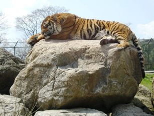 久々~に遊びに行ったら、じいちゃんが「秋吉台 サファリランド」に連れて行ってくれました。はっきり言って、これは、か~な~り珍しい。「もう、連れて行っても覚えているだろうから」というのが理由です。春は出産のシーズンなので、入ったらいきなり出産間近のシマウマが!スタッフが近づいてきて「お見苦しいものが見えるかもしれませんが、ご理解下さい」って言って去るから、まじまじ見ちゃうよね。ちょっと脱腸中??草食動物ゾーンは象やしまうまやサイがのんびり、まったりしておりましたが、(とにかくこの日はぽかぽか陽気で、動物たちはひたすら昼寝)二重ゲートを抜けるとそこは危険な猛獣ゾーン。クロクマやチーターやライオンやトラに目が釘付け。ちょうど、スタッフの方がクロクマにえさをやっていたのだけど、それを目がけてカラスやトンビが急降下!!果物を切ったのや小型のパンを4~5個1度に投げてるんだけど、そうすると、ヒューンって感じで降りてきて、あっという間にさらってしまう。クマは1個食べられればいいほう。全部持っていかれちゃうこともそんな栄養状態の良い鳥達だから、みんな大きいのよねぇ。それが翼をぶゎさっと広げると更に大きくて怖いほど。ここは猛禽類ゾーン?って思っちゃう。大人は「ここは、ロッキー山脈?トンビじゃなくてワシとかコンドルなんじゃない?」と言う始末基本、猛獣類もみんなお昼寝暖かいからねぇ・・・岩の上のトラ。大きくてカッコよいのに寝てます。サファリゾーンを抜けるとふれあい広場になっていて、いろんな動物にえさやりをしたり、乗ロバ体験をしたりできます。2日前に生まれたばかりの仔ヤギ。ユキちゃーんこんなに、ちいちゃいレッサーパンダはお食事中。えさの時間になるとみんな『ふうた君』してました。ホワイトタイガーは起きてました。「霧のむこうのふしぎな町」に出てくるトラ『タマ』みたい。ちびーず達はヤギや羊に固形飼料をやったり、飼育員にぶら下がって甘えるレッサーパンダにはしゃいだり(はて?我が家にもこんなのがいたような)思い出に残る楽しい一日を過ごせたようです。じいちゃん、ありがとね