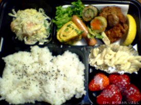 子供たちが春休みなのをいいことに、自分もちょっと春休みしてました。3日ぶりくらいの旦那さんのお弁当。しまった!画像がボケボケだ!!・青ねぎ入り卵焼き ・ウインナー ・花まる野菜串・鶏の唐揚げ ・マカロニサラダ ・野菜サラダ ・ご飯 ・苺今日は、旦那さんが帰ってきてから里帰り予定なので、以前食べたお弁当屋さんのお弁当箱を使いまわして、洗い物を減らしてみました。こういう黒い入れ物につめると、お花見弁当みたい。あけぼの(ニチロ)さんから発売されている「花まる野菜串」なーんか、野菜が少ないなぁと思った時の気休めに購入してみました。串の持ち手にとうもろこしの焼印とかが押してあって可愛い。でも、ちびーず2号のところでは、串・ピック厳禁_| ̄|○ダメジャン1個前のブログでタミフルの事を書いたら、翌日熱が!タミフルの呪いじゃ~~~(≧∇≦)ノ彡☆バンバン