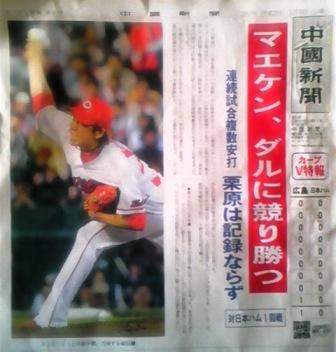 あ、書き終えて気付きましたが、無駄に長いです。興味のない方はスルー方向でよろしくお願いします。タイトルはもちろん、マエケンブログのもじりです。セ・パ交流戦に行って来ましたよ~。3時開門で4時過ぎには行ったのに、すでに座るところがなくて、席を探すのに苦労しました~。本日のお相手は日本ハム。お目当ては・・・ダルビッシュ~楽天戦にステキな大敗で(変なTシャツまで作って、ブラウン監督を刺激しといて、あれって・・・)今日の試合が、どこと言う訳ではないけど微妙なチームだったら、こんなに入らなかったと思う。本日3万2千人の大入りの半分は間違いなくダルビッシュのおかげかと。地元新聞の先発予想はマエケンだったけど、よそでは、ちらほらと今井先発の名前もあり。マエケンの前日のブログ更新がなかったから、多分投げるなぁとは思ってましたが、今井だったら私的にはダルも見れて超お得、と思ったり。でもでも、今井VSダルだったら格が違いすぎるなぁ・・・でも、ウルトラ貧打線だからダルを打てると思えないし、マエケンにむざむざ負けをつけるのも気の毒だし、と勝手に心配してましたが、マエケンにそんな心配は無用でしたね。見事な投手戦でした。ダルが最終回も投げてたら、間違いなく延長戦になってたと思いますが、投手を代えたので、ダルの投球に目が慣れてきたら打ちやすいのかも?と思ってしまいました。ダルを打ち崩せたら、何かが変わったかもしれないけど、やっぱり打線になりません。盗塁して2、3塁の大チャンスにも3、4番があえなくアウトになり、あ~あ、やっぱり・・・のため息。そんでもって、次の回に珍しく5番が打ったり、何でしょうねぇ、この打線。3番が微妙に問題視されがちですが、打率だけ見たらどこ見ても似たりよったりなので、あ~~、もう何番でも一緒か、と思ってしまう。たまに3割超えのバッターがいると思えば、時々しか試合に出してもらえない選手、みたいな。今日のヒーローは文句なしのマエケンとサヨナラ打を打った赤松でしたが、再三の東出の守備に助けられたところもありました。危なっかしい取りかたと、ファインプレーは紙一重だと思うので、今日は全部成功してよかったね、とホッとしましたよ。それにしても、野村監督は冒険好きですか?9回裏 栗原ヒットで出塁後、バッター中東そのままって・・・いくら経験を積むことが必要といっても、普段代走ばっかりで、ほとんど打たせてもらってないじゃないですか。それなのに、こんな大場面で打たせようなんて。この日だって初打席だし、なんかムチャ振りに近い感じがしましたね。こここそ代打を出して良い場面だったのでは?まだコマはほとんど残ってたんだし。先日も岩本を大チャンスでそのまま行かせてたけど、プレッシャーかけすぎw案の定、中東も岩本も打てなかったし。無駄に厳しいのもどうかと思いますね。さてさて、日曜日の先発は恐らく今井。明日も勝利の報告ができるように祈りたいです。このチーム、今は連勝しないと意味がないと思うから、今井は責任重大です。ヒーローではいつもおもろいことを言いたいマエケン。関西の血ですか?今日はもう1人のヒーロー赤松選手のアドレナリン発言に譲りましたね。赤松も関西(京都だけど)だし、先輩をたてましたかね?おっとな~。
