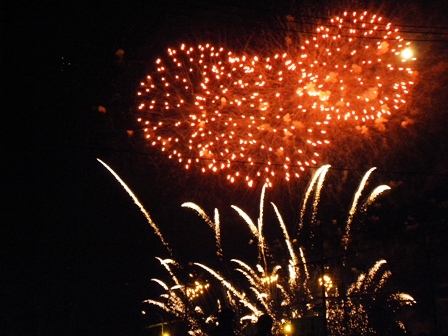 うどんを食べた後は、メインの花火大会会場へ。と言っても海沿いの場所は早くから行かないと場所を取れそうにないので、今年もちょっと下がった所から見物です。水中花火をあきらめなくちゃいけないけど、それでも全く無問題。花火で真っ暗な場所もすっかり明るくなりますこれは水中花火。ここからでも充分大きくて迫力満点でした。立ち上がって見てる人と比べても、花火の大きさがわかります?最後は空中ナイアガラとも言える、大きな枝垂れ。毎年人の多さと、出かける前の暑さに一瞬ためらうけど、やっぱり行くと満足です。今回は開始30分前にものすごい黒雲が立ち込めてきて、稲光もピカピカ。降ったらどしゃ降り間違いなし、といった感じで、どうしようとドキドキしていましたが、雨も降らず中止にならず、ちょっと空気も涼しくなって、素敵な花火の夜でした。