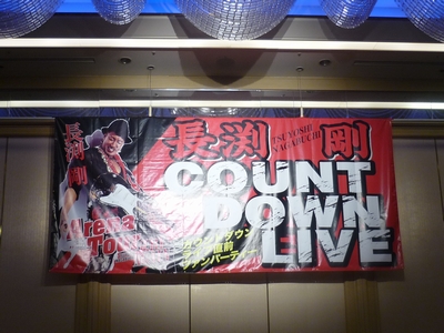 本当は剛からのビデオメッセージが流れる予定でしたが剛のリハーサルの都合上?体調?が原因で中止となりました楽しみにしてたけど、仕方が無いね・・・ 気を取り直して剛グッズがもらえる抽選会スタート最初の景品は、沖縄名物ちんすこう、シーサー、チョコなどでした私の狙いはもちろん剛グッズなので今ここで当たるわけにはいかない次々に抽選箱から名前を読まれるたびにハラハラドキドキ他の人が当たっては喜びながら拍手してましたなんて性格の悪い私・・・ちなみに一緒に参加した先輩は剛ステッカーが当たりました そしてついに剛グッズの抽選・・・カレンダー、ステッカー、マフラータオル、ビッグタオル・・・パンフレットはなんと剛のサイン入りもちろん狙いはパンフレットパンフレットじゃなくてもビッグタオルが良いなぁと考えてました。なぜか当たる気マンマン次々にグッズの抽選が終わり最後にサイン入りパンフレット約8名にプレゼントパンフレットが当たった人にはステージに上がり一言コメントを言う事になりました。一人で心の中で『え~何を言おうかな~?』と考えてました。まだ当たる気マンマン・・・しかし・・・・・・・名前は呼ばれませんでした今となれば、ちんすこうでも当たってほしかった後に先輩に『散々人の不幸を喜んでたから罰が当たったんや!』と言われました確かにちんすこうを当たってる人を見て喜んでました・・・ ガッカリしてたら、司会者の男の人が『みなさ~ん!あの垂れ幕ほしくないですかぁ?今回はビデオメッセージをお見せできなかったので特別にあの垂れ幕をプレゼントしちゃいま~す!!』主任らしき男性は唖然とした顔をしてた 垂れ幕とはコレのことです! 最後の最後で神様からのプレゼントなぜかこれも当たる気マンマンでした今回は司会者の人とじゃんけん大会めちゃくちゃ大きな垂れ幕だけど部屋に飾れるかなぁとワクワクしながらじゃんけんに挑みました。そしたら最初に負けてしまったはぁ~なんておめでたい私なんだろう パーティーも無事?に終わり いよいよカウントダウンライブへ参戦