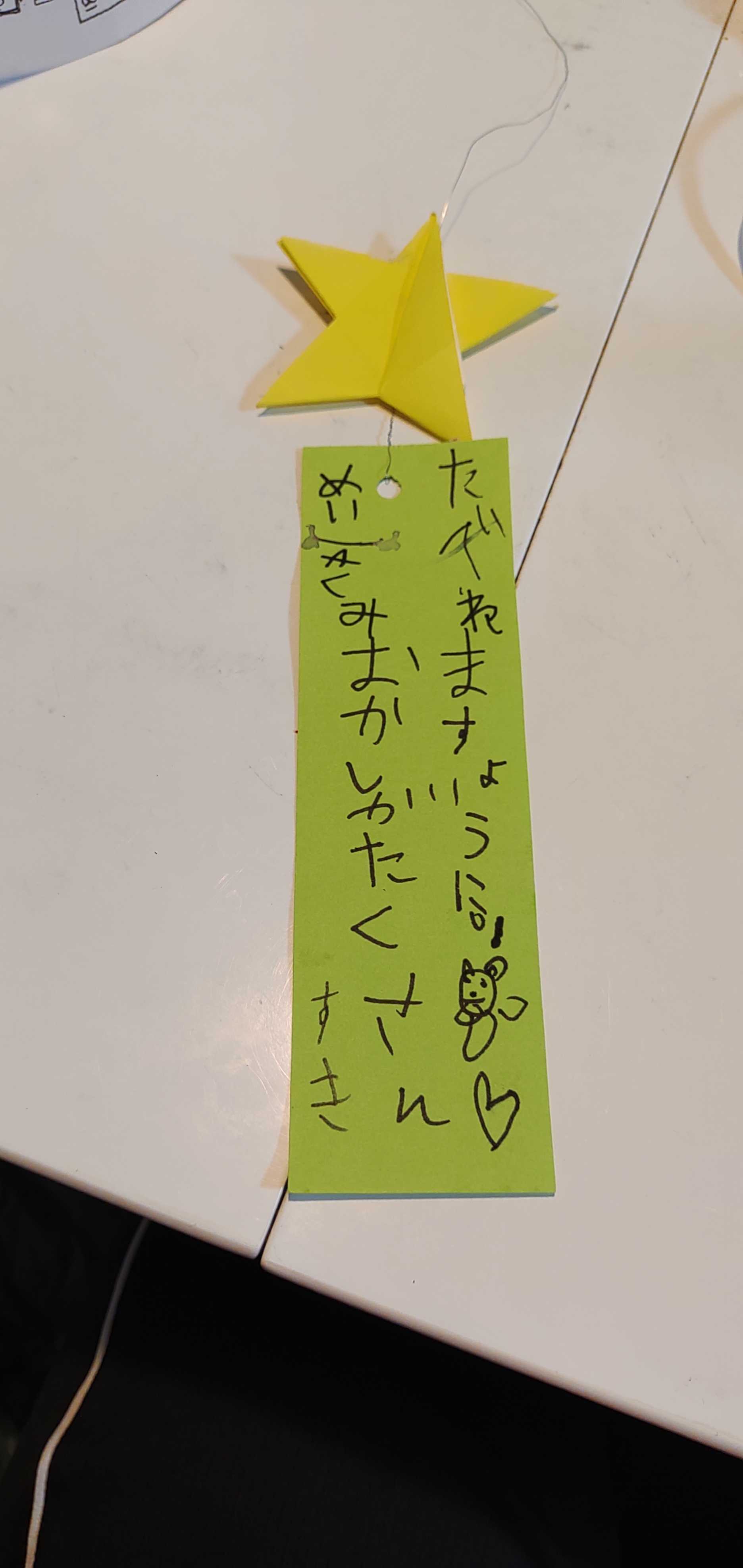 雲っていて、天の川は見えません学童で作成した、七夕短冊お菓子がたくさん食べたいそうです