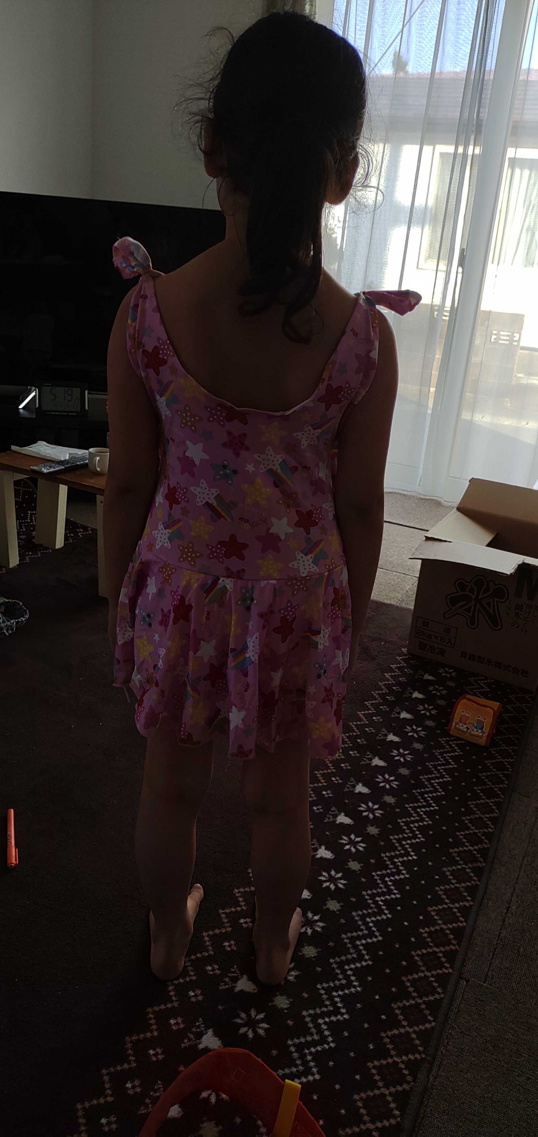 楽天市場で買った、子ども要の水着ふだん少し大きめだが、140をきているので、140を購入すごい大きい、笑肩の結んである部分を縫い合わせて、着させます😥
