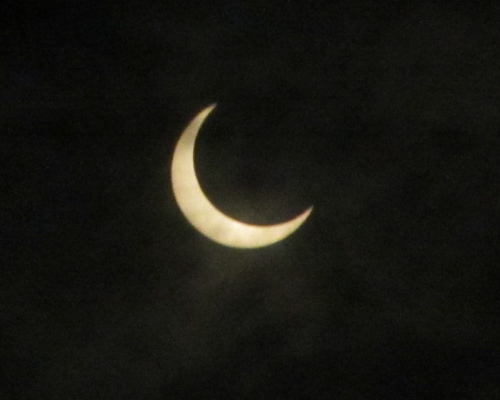 お天気が危ぶまれていた金環日食ですが、みんなの願いが届いたのか、各地で無事に観測できたようで良かったですね。私の住む地域でも曇ったり晴れたりを繰り返していましたが、金環の時間が長かったおかげでバッチリその姿を拝むことができました。前回の皆既日食(地域的には部分でしたが)に引き続き美しい天体ショーでした。まもなく金環!って頃にどんよりしてきてあ~あ 厚い雲に覆われちゃったのかぁと思ったのは間違いで、皆既日食のときのように、太陽の面積が小さくなってきたのでちょっと薄暗くなったんですよね。さらに吹く風が急に冷たくなって・・・雲が多かったのでつながる瞬間は見られませんでしたが、美しい太陽のリングになりました。普通のコンデジでもこんなに綺麗に撮影出来て嬉しいな。ちなみに太陽に色の違いは、使ってる日食メガネの違いです。オレンジになるバージョンと白くなるバージョンがあるんですねぇ運動会の振り替え休日のおかげで学校も休みだったし、家族でのんびり観察できました