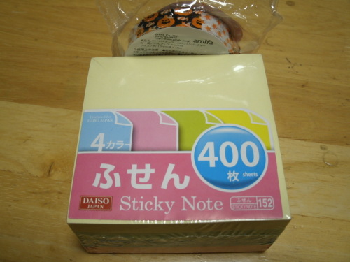 今日は晴れでしたが、風が強かったです。大型ショッピングモールの帰りにセリアに寄り店内を物色していると、ハロウィンのマスキングテープがあったので購入しました。もうハロウィングッズが発売になっているんですね。早いですね。マスキングテープは、無地を一番使用しています。色はピンクと空色ですね。用事をどちらかに書いて貼っています。私としては蛍光ではない黄緑色がほしいです。メモ用の付箋がなくなってきた(残り15枚)のでダイソーで見ていると、なんと400枚入りがありました。高さ約4センチ、約7.5センチ角。4色で、たくさんです。買い物に行く時や駅前で用事を済ませる時などに、付箋に行く順番を書いてその通りに巡って済ませています。電車や旅行に行く時などにも、メモしてお財布に貼っています。付箋は単発の用事や何度も繰り返す用事の時などにメモし、スケジュール帳に貼っています。付箋がこんなに便利だとは思いませんでした。今は何でもマステか付箋にメモメモです。↓ 楽天市場さんでの商品のご紹介です ↓税込3150円以上送料無料(一部地域除く)★大量注文可能●カラーブロックメモ 400枚 100円均一☆【万天プラザ 100円ショップ+雑貨】【メール便対応可】 ノートのようなブロックメモ。気分に合わせて選べる全3種類【メール便対応可】 【 TOTONOE 】 Block Memo ブロックメモ / メモ帳 / 付箋【RCP】カエルがブロック塀から覗いているよ♪concombreまったり付箋「のぞき見」FROG【て80】