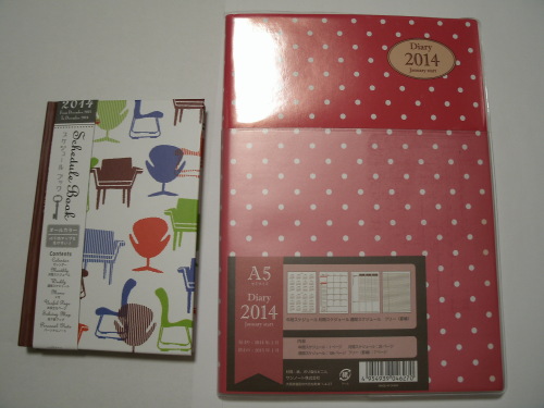 今日は曇りで、夜、一瞬、雨が降りました。今は曇っていて、月は見えません。毎年、この時期になると購入している手帳を今日、手に入れました。↓ 左:A6サイズ、ハードカバー、今年は椅子柄。左:A5サイズ、ポケットがついています。↓ 左の中身:午前と午後にだけ分かれている手帳です(バイト用)。絵が可愛い。↓ 右の中身:バーチカルタイプです(家用)。今年のよりも色が濃い目です。100均の手帳ですが、意外と可愛いし使い勝手が良いです。左のには後ろの方のページに「年齢早見表」、「国内郵便料金表」、「テレフォンガイド」、「地下鉄マップ」がついていて、何かの時にはさっと見ています。他に、日記用の手帳を購入予定です。↓ 欲しい手帳です ↓モレスキン2014年手帳モレスキン 2014年 手帳 デイリーダイアリー ハードカバー グリーン ラージ (MOLESKINE/モールスキン/スケジュール帳/1日1ページ)【2014年版/12ヶ月ダイアリー】【ラージサイズ】【星の王子さま】【モレスキン/MOLESKINE】【文房具ならペンルーム】モレスキン手帳 2014年版 限定品 星の王子さまダイアリー DPP12DC3T ハードカバー ラージサイズ <1日1ページ>「ブランド」 (3500)↓ 2014年版「レゴ」です。【2014年版/12ヶ月ダイアリー】【ラージサイズ】【LEGO/レゴ】【モレスキン/MOLESKINE】【文房具ならペンルーム】モレスキン手帳 2014年版 限定品 LEGO ダイアリー DLE12DC3T ハードカバー ラージサイズ <1日1ページ>「ブランド」 (3600)