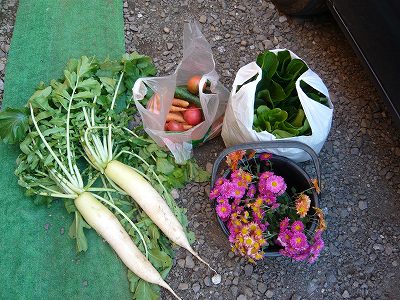 農家の嫁となって早十数年・・・普段の食べる為の野菜は全て義母が一人で作っています。やはり、かなり多く作っているので、義理姉や私の実家にもいつもわけてくれます。今日もエナンのテニス帰りに夜になっちゃいましたが、実家に寄って野菜を届けてきました。 大根、人参、ほうれん草、小松菜、そして今年はいつまでも暖かいお陰で未だに取れる夏野菜のきゅうりとトマト。それに父の仏壇に・・・庭に咲いていた菊のお花です。 もう少しすると黄色いのも咲きます。あ、それからこれ・・・ じゃ~ん みかんの木です 2本並んでいるのですが、1本みたい・・・ 今年はた~くさん実をつけてくれて色もこの暖かさで早く黄色くなりました。 なかなか忙しく、実家でゆっくりも出来ませんが、野菜を届けながらちょっとでも母の顔を見ると安心します。 母はいつもありがたいと喜んでくれます。惜しみなく自分が作った野菜を実家に持って行くようにと言ってくれる義母には本当に感謝しています。まだまだ当分、野菜作りは義母にお任せです~(・・・いいのかな)