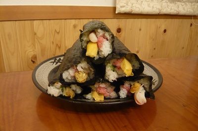 今日は節分ですね。そういえば、去年も節分の日にブログを書いたなあ~なんて思ってはっとしました気づかないうちにブログ開設一周年を過ぎていました・・・去年の今頃は、毎日ブログを更新するのが楽しみで楽しみで・・・それが今じゃこの有様です~まあ、マイペースでこれからも続けていけたらと思っています。改めまして、今後ともよろしくお願いしま~す去年も作った恵方巻。ちなみに去年のブログはこちら今年は面倒だからいいやと思っていたのですが、やっぱり作ろうとテニスの帰りに材料を購入してきました。恵方巻・・・七つの具が入るみたいですね。うちのは今回5種類だからただの太巻きかちょっと崩れていますが何とか出来ました。 リョーマは塾やテニスで夜にいない日も多いのですが、今日はちょうど何もなく、無事に豆まきが出来ました。 鬼のお面をかぶって例年通り大騒ぎ!?でした~