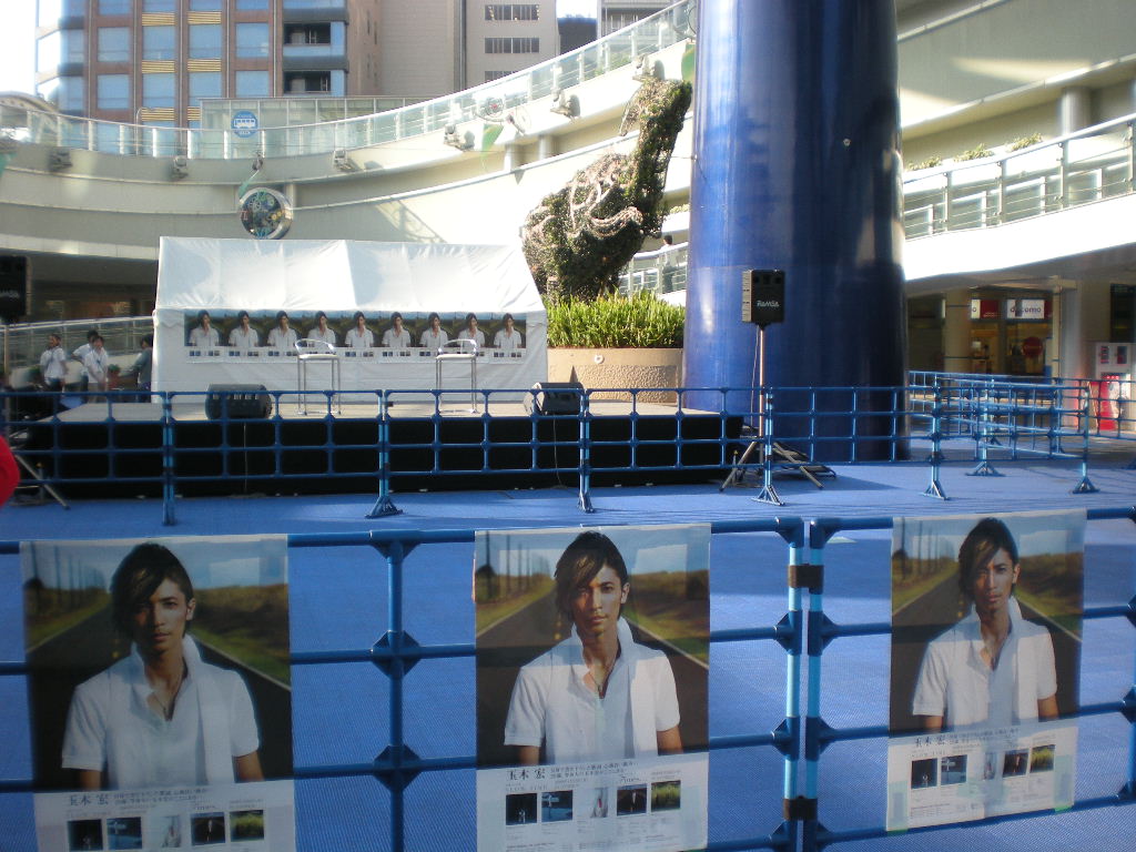 はぁ~、、、行って参りました、名古屋会ってまいりました、初 生 玉木宏様 もう、トロケました!!本当に今日もまだ夢の中にいるようで、、、何にも手につきましぇ~ん(^^; でも、覚えていることは書いておかないと・・・こんなレポではありますが、お付き合いくださいませ。++++++++ オアシス21銀河の広場で玉友さんと待ち合わせ4時半過ぎでした↓会場の様子ステージの奥のテントが控え室ステージはスペシャルトークということで、MCさんと玉木くんの椅子が2つ青い柵で囲われているところが、握手券を持っている人の優先スペースでも、狭いし、その周りや上からも結構見れちゃいそう!!今度は子供もつれてきてあげようと思ったのでした。 前日までの雨も止んでいいお天気♪風もきもちいい~♪会場は屋外のスペースとはいえ、水をはった屋根もありました名古屋はMUSIC JACKET GALLARYが行われてました(観なかったけど・・) だんだん、人が集まってきて、5時にスタッフさんの動きに合わせファンが動く!!整理券の番号順に呼ばれるのかと思いきや、そうでなかったので早めに入れてラッキー(玉友さんのおかげです♪)私たちは最前列のステージ左側のスピーカー前あたりをゲット!!どんどん人が入ってきて、狭い中立ちっぱなしで1時間待ちました。玉友さんとご一緒してて、よかった~!この待っている間のドキドキも、一人だと分かち合えなくて辛いよね・・・待っている間はず~っと【Times・・・】がエンドレスで流れていてました。その間、スタッフさんが何回も当日のCD販売のこと写真や動画が禁止なことなどの注意事項を何度も話されてました。 私、だんだん足が疲れたのと緊張で少し足がつっちゃったのね・・・(汗;でも、一番前で柵につかまっていられたので助かった~! で、5分くらい前になった頃でしょうか、、、会場が少しざわつき・・・私たちのちょうど左側の人たちがスタッフさんたちと何気に歩いてくる玉木くんを発見した模様!NHKビルの方から普通に歩いてきました! 青い玉木くんじゃぁ~~!!すぐに控え室に入っていかれましたが、その前にみんなでファッションチェック♪白いシャツ(遠目からは白だけどよくみると格子柄だった)の上に目の覚めるようなブルーのTシャツの重ね着ロゴが【Let's Lock】と書かれてましたなんだか、ちょっと??なんてはじめは感じちゃったんだけど(ごめんね~ヒロシ、、、だってお台場のあれが素敵だったもので・・)それは、ドラゴンズブルーを意識してのことだったのですねぇ~??本当かいな~!?↑ 本日の中日スポーツ《ドラゴンズブルー風のさわやかな衣装で・・・》と書かれておりました。 MCの高橋正純さんがご登場 (この順番イマイチ覚えてないの・・・もしかしたら高橋さんがお話されてたときにヒロシが歩いてきたのかなぁ~?)高橋さん、ワタクシ地元静岡のK-MIXのパーソナリティで人気のお方会場を盛り上げるためにチョッとトークや注意事項などお話でも、会場の雰囲気みて「もう、早く呼べってかんじですよね~!」って高橋さんも苦笑い!「でも最後まで僕もいますからね~」って。で、その時それまでバックミュージック的に流れていた音楽が大きく【SLOW TIME】がかかって、始まった~!!高橋さんのMC案内に乗せてヒロシ御登場~!!きゃぁ~~~~!!! もう、なんておちゃめさんなのぉ~!サイドにいるスタッフさんが掲げているような『撮影禁止、録画禁止』のプラカードでお顔隠してぇ~(^^)にこやかに登場だったのです~!会場も笑い~!!喜び~~!! ・・・で、すみません、ヒロシの登場までこんなにひっぱる私って、、、おわかりでしょうか、、、、最前列の初、生ヒロシですのもう腰が砕けそうで、半分以上記憶がなく順番にレポるなんてできませんです~(大汗;)ということで、冷静なレポはここまで(^^;いったん切らせていただきます。 その2へ続く。。。長々とありがとうございましたにほんブログ村