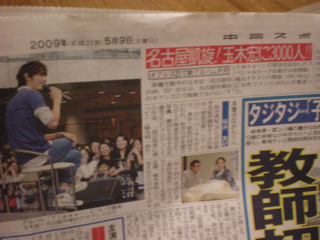 爽やかな風が吹きぬける5月毎日よいお天気で、清々しいわ~~!! GW真っ只中におかれましてはみなさん、おでかけやイベントで愉しんでおられますでしょうか・・・我が家は、とあるやんごとなき事情によりまして、、、もちろん、今年も、、というより例年以上に質素なGW生活であります。(寂しいお財布事情だがや~~!) でも、ちょっと外に目をやれば、隣の神社から小鳥のさえずりや新緑が眩しくちょっとお散歩すれば、観光客でにぎわう湖ちょっと車でドライブすれば、もうGW満喫だぁ~!!(無理やり)我が家の子供たちは自然をこよなく愛する自然児ゆえGWだから、遊園地や人ごみに連れて行け~!とは言わないの・・・昨日も湖で釣りしてハゼ釣って夕飯の足しにしたの ありがとうなの・・・(どんだけ~~!) そして、母は毎日が祭り!!『玉木宏祭り』 大好評開催中です♪朝から【SLOW TIME】ガンガンに流して《休もう~♪休もう~♪》家族をお休みモードに誘いつつ私はまったりと家事をこなし普段やらない大物の洗濯や床磨きなどしながら玉木くんのDVDチェック!午後はお買い物しながら、帰りに本屋さんで玉木くんの雑誌チェック!! 昨日は、朝からズムサタで映像堪能して(朝から上半身裸のタケオだった・・・喜)雑誌「オリ☆スタ」「CINEMA SQUARE」「+act.」それぞれ、いろんな玉木くんが溢れていて、、、TVつければ、ミスドやマツダや永谷園、、、CMも観れちゃって ほんと~に、ごちそうさまです!! GWの締めにはお楽しみ豪華スウィーツならぬヒロシとの握手会が待っているのですね~!! あ、ダメ、、、それ考えちゃうと、、、しばらく思考停止になっちゃうから、、、失敬にほんブログ村