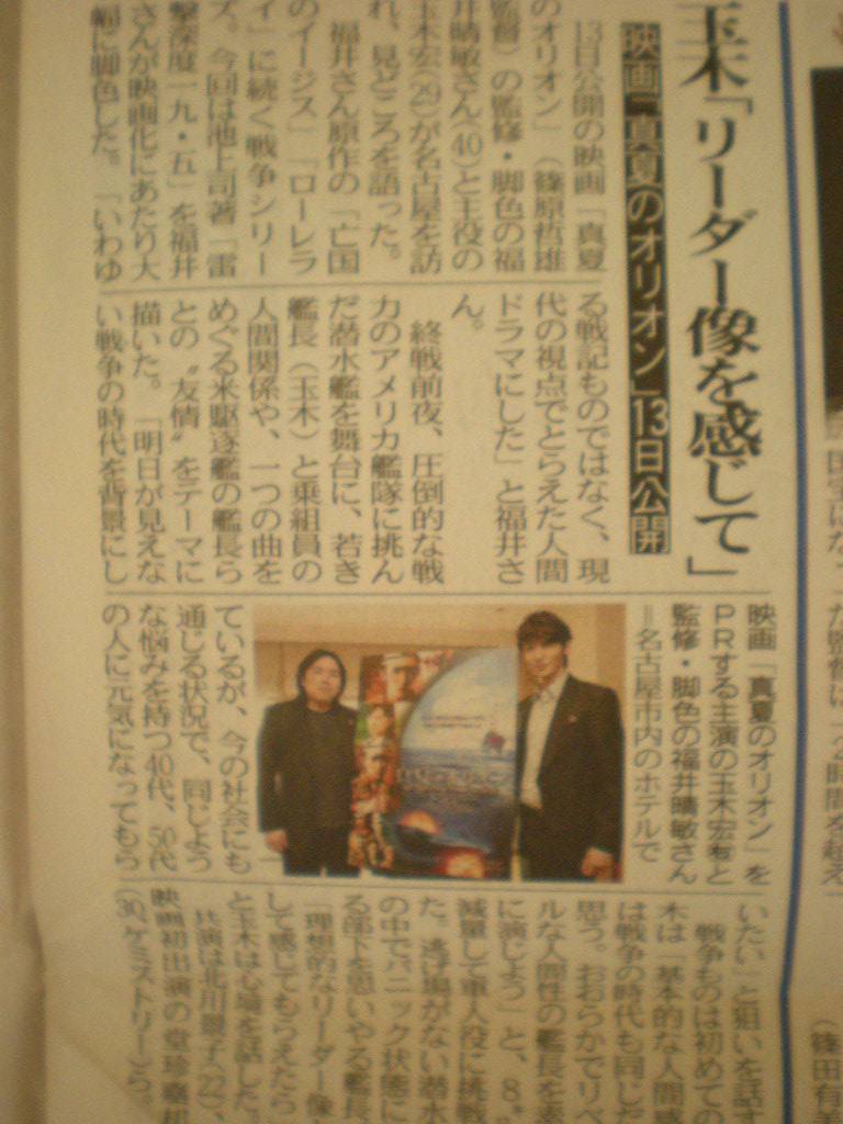 じつに、もったいない、、、 倉本艦長もそうおっしゃってますぅ~!エンドロールが流れた瞬間に席を立っちゃ、、、イヤ、、、そんなにあせってシアターでちゃ、ダメ、、、 まだ、エンドロールの最中で映像ながれますからぁ~~~!いつかさんの曲、最後まで聴かないで帰るなんてホント、もったいないですからぁ~~~!! しくしく、、、、本日、水曜日は当地のTOHOシネマズ、レディースデーにて多くの女性(おもに、中年・・・笑;)にて賑わいをみせていたのでありました。そして、同じ時間帯に劇場に着かれた女性の方ほぼ全員が【真夏のオリオン】のシアターに流れていって、、、なんだかすごい親しみ感じてしまったのでした(^^)vそんなおばちゃんパワー(自分でおばちゃんいうなぁ~)溢れるシアターの中なぜか私の列には中年男性ばかりで、、、なんだか、私一人が泣いていたような・・・(^^; でも、子供がいないって、やっぱり思いっきり映画に浸れるんですよね2回目鑑賞してわかったこと、発見したことがいっぱいありました!前回はモールス送り合うところにすごく感動したのですが、今回はその後の機関長とのやりとりあたりに感動~!!でもって、回天役の方たちの演技にも感動~!!あと、鈴木くん、、、いいよ、鈴木って~のが(笑)命令されるたびに、ちょっと嬉しくなる♪(← おばか) で、本日何が一番いいたいのかと申しますと、、、、 スポニチ、なんでこのタイミングなの??でもって、静岡県西部のスポニチは1面どこにも見当たらないですが、、、コンビニの当地のスポニチと今朝のWSでご紹介されていたスポニチって、、、ちがうんですかぁ~~~~???? 別に吉高ちゃんとのお付き合いは、いいけどね、、、ヒロシが幸せなら (って、言いながら朝5時半に息子に「ヒロシが熱愛だって!」と起されてあわててコンビニ行ったのはどこのどいつじゃぁ~~!!笑;) でもね、どこかでもこの噂以前にも聞いたし、、、本人も事務所も何も言ってないし、、、当の本人はもう今、ヨーロッパだし、、、あんまり引っ掻き回されるのもね。だから、あんまりまだショックとかびっくり~とかはないです。ホント でも、玉木くんが長いことヨーロッパで日本にいないとなんだか寂しくってしょうがないデス、、、(涙)のだめの撮影、順調かなぁ~?はうん、、、赤ワイン飲んでリラックスしてるかしら~?ヨーロッパからメールってあるのかにゃぁ~?? 千秋様~~!体脂肪は6%でなく、もう少しあってもいいかとおもわれますぅ~!!(大きなお世話です~(^^;)にほんブログ村