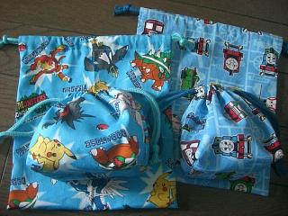 このネタ、、少々引っ張りすぎでごめんなさい。ちょうどエコ交換会の作品作りに時間をかけているうえ、交換会の作品は当分画像UPできないので、これでネタをつないでいます^_^;今日は兄弟2人分のコップ袋と皿袋です。これらも何の変哲もない、キャラ生地オンリーで作ったごく普通の巾着です。名前のついていない裏側を上にして画像を撮っています。巾着の紐は我が家の在庫で適当でよいとのことだったので、兄弟でそれぞれ色を変えてあります。ポケモン柄のお兄ちゃんはエメラルドグリーンの紐、トーマスの弟くんはターコイズブルーの紐 です。生地だけで十分わかるのですが、さりげない違いを出してみました^^この紐は、以前手芸ナカムラさんで買った福袋のもの。5色各50mの紐の福袋なので、紐はわんさか家にあるのです。 はてさて、ようやく自分や娘の服作りが進み始めて気分一新!ニットを縫うのは久しぶりなので楽しいです♪深夜の今の時間帯にこの日記を書いているのは、当然今までミシンを踏んでいたからでニットソーイングはやり始めると早いから、ますます嬉しいんですよね^^ポチッとご協力をお願いします^^