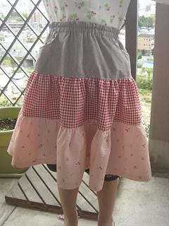 娘のスカートが足りないので至急作りました慌てて撮ったら余計なものが写ってます>< 型紙:orika ヨークスカート5種 のティーアドスカート サイズ120 生地:無地・・・★☆★ショップオブザウィーク受賞記念セール第2弾★☆★今大人気のスペックワッシャーを40%OFF!!! ブラウン無地 赤キンガム・・・お友達からもらった生地 ピンク・・・さくらんぼワッフル生地(手芸ナカムラ) 今持っている生地&型紙でどんなスカートを作ろうかかなり悩んだ末にこんなのができました。最初に出来上がってみた感想は、、う~ん、ちょっと派手すぎた><まぁ子ども服だしいっかー、くらいでイマイチでした。が、はかせて見るとこれはこれでカワイイかも??ティアードスカートならでわのフワフワ感がいいですね画像では見えにくいですが、ポケットもつけていて、ポケット口に山道テープをのぞかせています。裾にもつけようか迷ったのですが、このままでも十分派手なのでやめました^_^;娘は気に入ってくれたようなので、良かったです。1年前までジャンパースカートやワンピースばかり着ていた娘ですが、今は全然着なくなりました。上下セパレートになった普通のスカートを好むように。それでしばらくはスカート類を増産することになりそうです。ポチッとご協力をお願いします^^