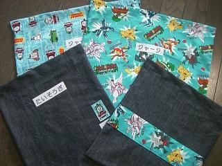 先週から交換会の作品作りに追われていた私でしたが、この週末は別のことをしていました。というのも、先日お引越ししたばかりのお友達から泣きのお願いが入りまして。なんとか子どもさん2人の入園が決まったものの、手作りしなくてはいけない園グッズがたくさんで間に合わないから作って欲しいと。慣れない土地に引越したばかりはタダでさえバタバタ忙しいのは同じ転勤族としてよーーくわかるので、協力することに!私が生地を買いに行き、写メールを駆使してお友達に生地を選んでもらいましたよ。とりあえずは至急必要な袋類を縫い縫い。お弁当関係はまだ日にちに余裕がありますしね紐をまだつけてませんが普段はキャラ生地を避けるお友達ですが、今回は時間がないのとお子さんのたっての希望でキャラ生地メインで定番の園グッズです。サイズ指定があるうえ、体操着袋とジャージ袋は生地を替えてくださいとの園から指定があり、体操着袋はキャラ生地を裏側にボーダー状に縫いつけて変化をつけました。(ハギレをうまく利用してます^^)「たいそうぎ」「ジャージ」とつけるのも園からの指定。プリンターで印刷できる布で作成、ついでに組・名前のテープも印刷して縫いつけてます。これ、それぞれ30cm角と40cm角でけっこう大きいです。ということで、今から製作の続きにとりかかります!娘は今日が始業式、午前中のみの貴重な時間を製作に充てねば!!もう1つ急ぎのバッグがあるのでそれを仕上げてすぐ発送です 1日ワンクリックをお願いします^^