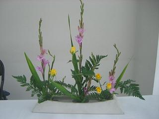 今日のお稽古は次回の研究会をにらんで「ならぶかたち」でした。もとも花材は違うものですが。今日は調子がよく?すんなり入って先生にみていただくと、少しだけ直しただけでOKがでました注意されたのは、挿し口だけ。 この花器は横に長いカタチですが、この細長い中で挿し口を三角形を描くようにいれなくてはいけなくて、剣山の位置をなおしていただきました。時間が随分余ったので、同じ花材を使って別の形にいけなおしてみました今度は「ひらくかたち」に。主材のワットソニアはたてる方がキレイだし、「たてるかたち」にしようかと思ったのですが、もう長さが足りないだろうということであきらめました。が、、「ひらくかたち」はいけにくかった><やっぱり花材の特性を考えたらたてていける方がいいんですよね。無理にねかせていけるのはいけにくくて当然と先生に言われましたまぁでもしょうがないですよね。全く同じ花を使ってもこんなに雰囲気がかわります。こういうところがいけばなの楽しさの1つでしょうね ポチッとご協力をお願いします^^
