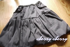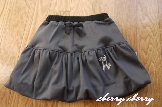 先日、委託先のMamachenさんから電話が昨年作ったこのバルーンスカートをお店で見てくださったお客様が、当時は赤ちゃんがお腹にいたので買えなかったけど、先日作ったバルーンスカートを見て買えなかったバルーンスカートを思い出して、もっと小さいサイズはないの?という質問をうけたそうで。小さいサイズで合わせやすい色のものをとのことで作ってみました 型紙:ORIKA ヨークスカート5種よりバルーンスカート(一部アレンジ) サイズ90 生地:濃いグレーのフライス昨年作った時のように、薄いグレーの生地があればよかったのですが、今の在庫の中にはこの濃いグレーしかなくて><とりあえずこの濃いグレーで作りました。90サイズならポケットはなくてもいいだろうと、ポケットなしで制作。ポイントも兼ねて、ウエストゴムの部分を別生地にして(ここが型紙からアレンジした部分です)います。ワンポイントはRickRackさんのフロッキープリントです。安全ピンにレースのようなのがついているデザインのプリントです^^もうちょっと下位置につければよかったですね><さらに前後わかりやすいように、ウエスト中央に黒レースで作ったリボンを縫いつけました。これはこれでシックな雰囲気でよかったかな~~?