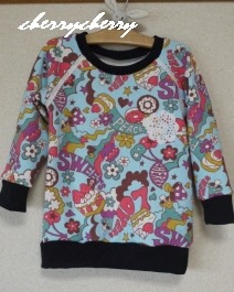 型紙:Milimii キッズトレーナー&ワンピース サイズ100 生地:◆大人気のため10月24日13時再販スタート!◆☆いすず秋の大収穫祭≪3≫☆超大人気ニット♪『スウィート☆キッズ』コットン100%裏毛ニット冬に向けてトレーナーを作り始めました。まずはにぎやかな柄でシンプルなトレーナーです。前にのみ、ラグランの縫い目部分にストレッチレースといつもの手編みドイリーをアクセントにつけています。リブ生地は紺色を使っていますが、色がきつすぎたかなぁ?紺ではなくて、青の方がよかったかも?まぁ、これはこれでよかったかなぁ・・・・?
