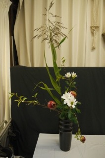 花材を見ても何も思わなかったのですが、今日のお稽古は文人調でした!文人調というのは、中国の文人趣味を背景として、文学的表現をするいけばなです。南画に描かれた花材しか使われないという特徴があります。こういう勉強は先日の地区別教授者研究会の筆記のために勉強したはずなのに、花材を見てピンとこないのはダメダメです(^^ゞでも何せ、お稽古で文人調をいけるのは初めてなんです。なので正直、筆記の勉強をしていてもなかなか頭に入ってこなかったのが正直なところ(^^ゞそんなわけで、今日の花材の柘榴(ザクロ)や葦(アシ)を取り扱うのも初めてでした。しかも文人調にはカタチに決まりがないのです。ある意味自由にいけてよいのでとまどいもありましたが、他の方がいけていらっしゃるのを参考にしつつがんばってみました先生からの指示で、柘榴は実を中心にいけるので、葉っぱはちょっと残すだけで取ってくださいとのこと。葉っぱがふっさふさだったのを、ほとんど落としました。骨格となるところは我ながらうまく入ったかなぁ?と思いつつ、足元や奥行きを出すために後ろに流すのがうまくできなくて四苦八苦。先生にみていただくと、やはり苦労した部分を直されました。下に垂れさがっている柘榴や画像右側、菊の後ろにチラリと見えている柘榴は後ろに流しているのですが、その2枝は先生がいれてくださいました。あとの骨格部分は、柘榴の余分な枝を落とされたぐらいで、うん、いいよ~っと!いや~、自分でもいいかなぁと思っていた部分を先生に認めていただけて、ものすごく嬉しかったですなんだか、先週の研究会で参考花に選ばれたのが自分の中で大きな自信となっていて、いけていて楽しいんですよね~♪今の先生は偉大な先生なのもあって、毎回のお稽古での集中力が違う気もします。今までの先生もすごい先生でしたが、お互い主婦なので時には主婦ならでわの会話があったりして、なごやかにお稽古していたんです。どなたかのお土産のお菓子とお茶をいただいて休憩もとりつつお稽古していたのが、今のお稽古場でそういうことはありませんから(^^ゞ花材もいいものを使う分、花材費は高くなったりしていますが、その辺はしょうがないことですし、勉強になるのは間違いないですから。そんなこんなで、改めて引越前のお稽古との違いを感じつつ、新しいことを学ぶ喜びを感じつつのお稽古だったのでした。 ≪P.S.≫ 二輪パッキン菊について文章ばかり長くなってしまってすいません。今日の菊は2輪パッキン菊というのですが、「パッキン!?」って何だろうね??と受付の方と話していたら、それを聞いていた先生から説明がありました。パッキンというのは、花芯が見えて一重咲きのことだそうで、一重咲き・八重咲きのような区分わけで、パッキン咲きということなのだそうです。今日のはそれが2輪ついているので、2輪パッキン菊というのだそうです。