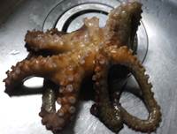 今日は早起きです。といっても、もちろん朝型の旦那に起こしてもらって、ですが。早起きの目的は朝市に行くため。近くの漁港(姪浜漁港)で毎週日曜日に朝市をしているという情報をゲットしたため、行ってみることにしたんです。開始時間は朝5:30 さすが漁師さんの朝は早い!!そういうわけで真っ暗な中、旦那と出かけてきました(娘は前日に聞いたらいかないというので、お留守番です)いや~、暗い中そこそこの人が集まってましたよ~。魚はもちろんですが、野菜、干物、パン屋さんまで、合わせて15軒くらいかな~?野菜が意外と安くて結構買ってきました。今、野菜高いですよね。なのに葉物野菜(小松菜とかほうれん草とか水菜とか)が100円とかだったのでね。魚の方も近くで獲れるものは結局一緒なんでしょうね~。どこも似たような品揃えの中、タコをゲットしてきました。いや~、安かった!!\(^o^)/他にはシャコやアナゴ(さばいてあるもの)、カレイ、小さめのカニ等がならんでました。旦那はシャコを欲しがったのですが、シャコはお料理したことがないし、食べたこともあんまりない私なので却下してきました(^^ゞ場所が近いし、人出も多すぎず少なすぎずいい感じで、これからもたまに行ってみたいと思いました帰宅したら調理しないとね! ということで朝からタコと格闘しましたよ実は家に帰ってから気づいたのですが、丸ごと1匹の生だこを調理した経験はあるのですが、生きているタコは初めて!ネットで調理の仕方を調べたら、ちゃんとシメる方法も書いてあったのでそれをやってみることに。ビニール袋に入っているとおとなしかったので、シンクの上にひっくり返したら・・・ここぞとばかりに動き始めるタコ!!!起きていた娘と一緒に朝からギャーギャー言ってましたよww包丁でツンツンと突いたら意外と固い!?タコの抵抗を感じました。シメる時は目と目の間を一突き!らしいのですが、意外と固いしバリバリ生きているので怖いんですそれでもいつまでもこうやってても作業は進まないわけで、、、、エイッと気合いをいれて包丁でブスッっとやりました、、、ハゥその途端、タコの皮膚がキューっと縮んで急所だというのがよくわかりました。が、、タコの生命力ってすごいんですよね。。足はずっと動き回る(のたうちまわる!?)んですよ;;なので、その後の作業も苦労しましたわ 娘が撮影たくさんの塩でもんでヌメリ取りをしています。ここまで来ればもう大丈夫。当初は朝から刺身にしてみようかと思ってましたが、うまく皮をむくことができず。。刺身は断念して、火を通して調理することにしましたよ。 茹でて切られた後この後、桜煮?を作りました。今晩はタコの酢の物をします。あとは自家製ニンニク醤油でヅケにして冷凍しました。(後日から揚げにします)魚を調理するのは基本的にできる方ですが、さすがに生きているのは気がひけますね;;でも、おいしくいただきました~~