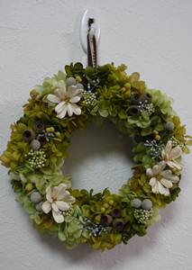 今日の福岡の予想最高気温はなんと15度!?春の気温ですね~~。ここぞとばかりにせっせと洗濯をしているるうるうです^^先週、近くにあるとわかったハンドメイドも扱うSHOPに行ってきました。行ったのはivoryさん。昨年10月(だったかな?)にオープンされたばかりだそうです。店主の方がブリザーブドのお花のリースを作る方なんだそうで、とっても素敵だったので1つ買ってきました^^ とっても素敵でしょ~?何色ベースのものにしようか迷って緑を選んできました。この緑ベースはよく売れているらしいです^^リビングの食卓の横の壁が、何にも飾り付けしてなくて淋しいのでそちらに飾っています^^本当は押しピンで穴をあけたいのですが、旦那が穴をあけたくないと。。それで、剥がしたいときはキレイに剥がせるテープがついたフックをつけてみました。リースなら軽いし大丈夫かな~っと。が、、1週間くらいたつとやっぱりダメで落ちちゃいます;;壁が少し凸凹しているので、くっつきが悪いみたいで。。穴をあけずに壁がキレイなままでくっつける方法、、ないですかねぇ。リースの他にもい軽いもので飾り付けしたいのになぁ。。