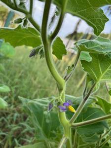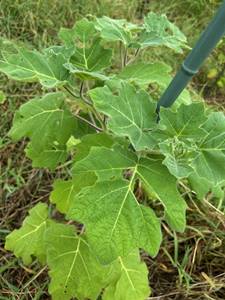 今週の畑の記録です。今年は7月がとんでもない猛暑の上、ほとんど雨が降らなかったので畑の作物に大きく影響が出ました。それが先週末頃から各地で被害が出るほどの豪雨。その後もちょこちょこ雨が続きました。おかげでここ2、3日は気温が少し下がって体はラクになりました。私が住んでいる所や実家付近は、豪雨による被害は出ていませんが、能登の方にも被害が出ていて心を痛めています。雨が上がった今日の畑は、雨で草ボーボー度合いがさらに増しましたが、雨のおかげで十分な水分を吸って元気になった物もあります。2025年8月13日フォックスフェイス成長がイマイチだったフォックスフェイスが急に元気になっていました。ナス科の植物ですからね~、水大好きですもん。昨年は今頃に実が黄色になりはじめていたのに、1~2か月分くらい成長が遅れています。水をすって木を大きくし始めた感じなので、これから開花して実がついて色づくにはう~ん、、、秋の花展に間に合わなさそうです画像は撮っていませんが、ソラナムパンプキンも元気に。こちらは少しだけ実をつけだしたものもありますが、貧弱な枝なので、これからでも大きくなってくれれば!2025年8月13日女郎花先週良さげな枝をけっこう切り花にしたのに、前に摘芯してから成長した脇枝が育ってきたようです。9月初旬に使う可能性があるので、このまま育ってくれれば2025年8月13日藤袴早くも蕾を付け始めました。調べたら昨年は8月下旬に同じことを書いていました。昨年より確実に蕾をつける時期が早まっていて、暑さのせいなのか秋の花が夏に季節がズレこんでいくのが怖いです。2025年8月13日吾亦紅ピンクタンナ昨年、お花の先生からいただいたピンク色の吾亦紅です。春から華奢な芽吹きでしたが、少し成長した頃に草に隠れて、草刈り機で上部を切ってしまうアクシデントがありました。 でも上部だけだったのでその後も成長してくれて、画像はボケてますが1つだけ小さな花をつけていました。 品種名の通りピンク色です。株が小さいので当然花も小さく。。。もうちょっと肥料をあげたほうがいいのかなぁ。。。2025年8月13日鶏頭 アクト、雅1カ月ほど前にに植え付けた鶏頭も、少しずつ花色が出てきました。実家のご近所さんでは、立派に育った鶏頭が豪雨と風で軒並み倒れてしまっていました。我が家は植え付けが遅れた分、小さいので被害にあわずにすみました。また画像は撮っていませんが紐鶏頭も雨をすってグンと成長していました。倒れるのが怖いので今日は紐をつかって倒れないよう予備措置をとりました。2025年8月13日コバノズイナ葉が早くも紅葉がかってきました。1枚だけとってもキレイな赤色でした^^2025年8月13日紫陽花エンドレスサマー名前の通り、何度でも咲く紫陽花です。今年は最初の花が終わった頃に半分以上切り落としたので、その後から伸びた枝についた蕾が少しずつ開花しているので、今頃こんなキレイに開花していました。2025年8月13日木瓜巨大に育っている木瓜ですが、いつも秋までしっかり葉があるのに、どうやら水切れを起こしたのか葉っぱが早くも落ちていました。でもそれで実がけっこうたくさんついているのに気づきました。この画像だけで5個くらい実が写っています。この木瓜はトゲがひどくて、いけばな向きではありませんが、実木瓜をいけるのに実だけでもありがたい!2025年8月13日ひまわり オークションでゲットした黒種写っているのは私の手です。直径30cm弱の大きさのキレイな黒種の枯れ向日葵が育ちました画像奥に写っているのは、普通の白黒の種の品種の枯れ向日葵ですが、やはり黒種の枯れ向日葵はとてもキレイで感激しました。大きさもあって迫力があります。本当は今すぐ作品にすれば、種の周囲が生の状態でとってもいいのですが~。今すぐいけるタイミングがないので、こちらはこれから乾燥させて、完全に枯れ向日葵とします。きっとどこかの花展で使われます2025年8月8日梅もどきこちらは自宅の畑で主人が育てている梅擬です。小さな花がカワイイので撮影してきました。左の画像でわかるように枝にくっついて小さな花を咲かせます。 右の画像は花を拡大しました。5mm~1cmくらいですかね~。これが実になってうめもどきとなるわけです。いけばなをしていると、実の状態しか見ないので花を見るのはとっても新鮮です