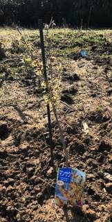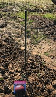 添え木より少し短い感じで、細い枝がいくつか出ています。 保証書つきのこちらの苗、ちゃんと根付いてくれるかなぁ?