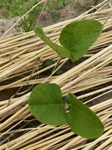 種を鳥に食べられないように、自家製麦わらを敷いていたのが発芽してこんな感じにそだっています。